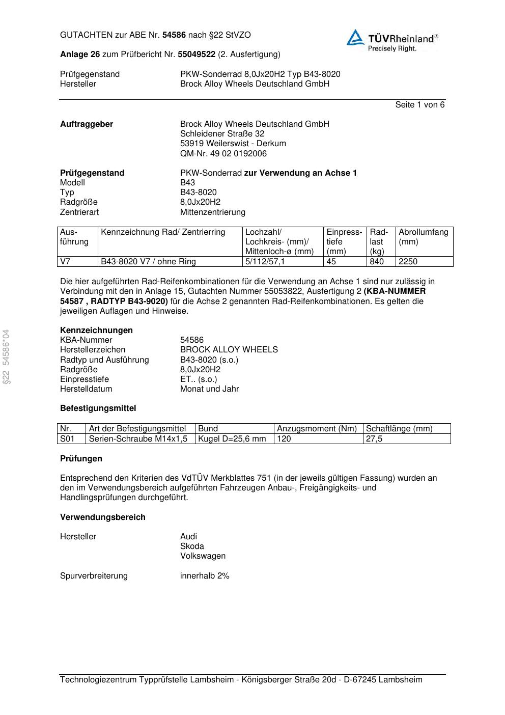 Felgengutachten / abe für Alufelgen Brock B43-8020 (8Jx2 ET 0, Mittenloch 0 mm) mit KBA 54586 (Zertifikatsnummer 54586). Hier kostenlos als PDF herunterladen. Der Download-Link ist 24 Stunden gültig und kann bis zu zwei Mal verwendet werden.