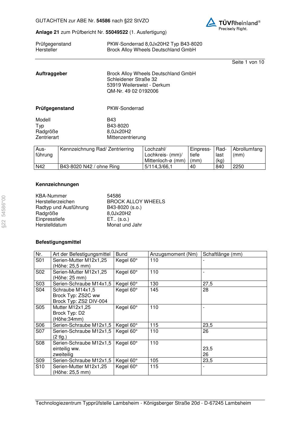 Dieses Gutachten (abe) bezieht sich auf die Alufelge Brock B43-8020 in der Ausführung 8Jx2 ET 0, Mittenloch 0 mm (KBA 54586). Im PDF findest du typischerweise zulässige Reifengrößen, Auflagen/Anbauhinweise und – je nach Dokument – Hinweise zur Eintragung.