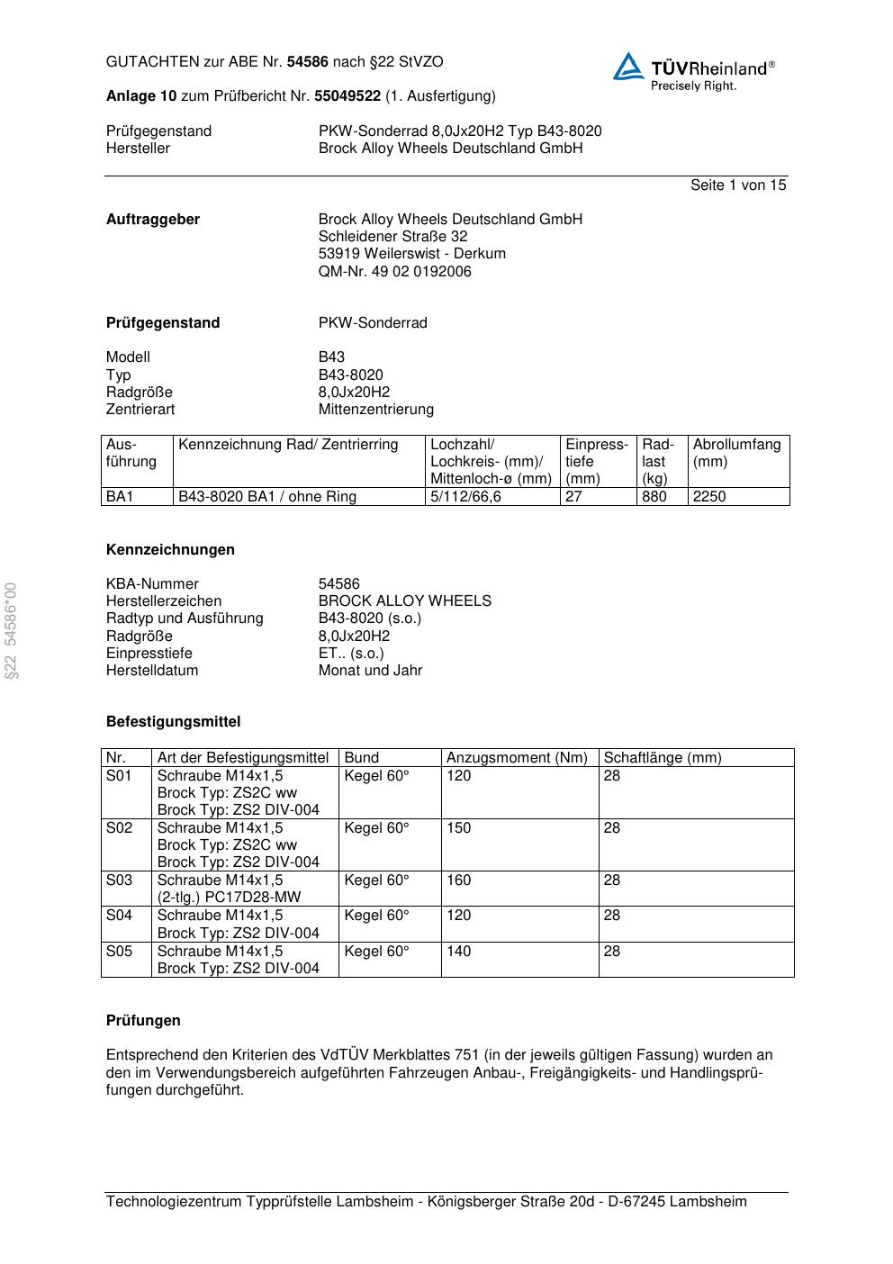 Felgengutachten / abe für Alufelgen Brock B43-8020 (8Jx2 ET 0, Mittenloch 0 mm) mit KBA 54586 (Zertifikatsnummer 54586). Hier kostenlos als PDF herunterladen. Der Download-Link ist 24 Stunden gültig und kann bis zu zwei Mal verwendet werden.