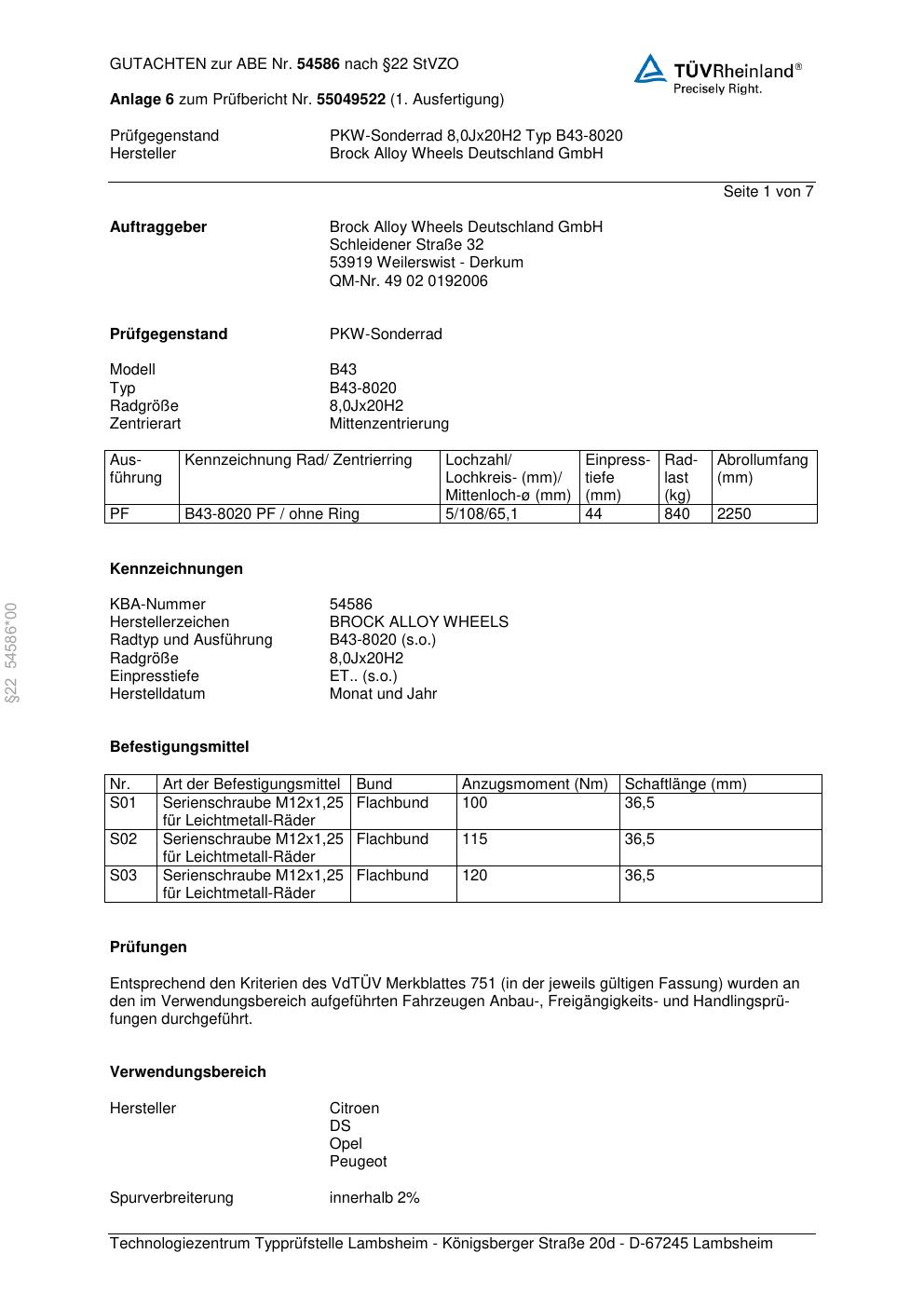 Dieses Gutachten (abe) bezieht sich auf die Alufelge Brock B43-8020 in der Ausführung 8Jx2 ET 0, Mittenloch 0 mm (KBA 54586). Im PDF findest du typischerweise zulässige Reifengrößen, Auflagen/Anbauhinweise und – je nach Dokument – Hinweise zur Eintragung.