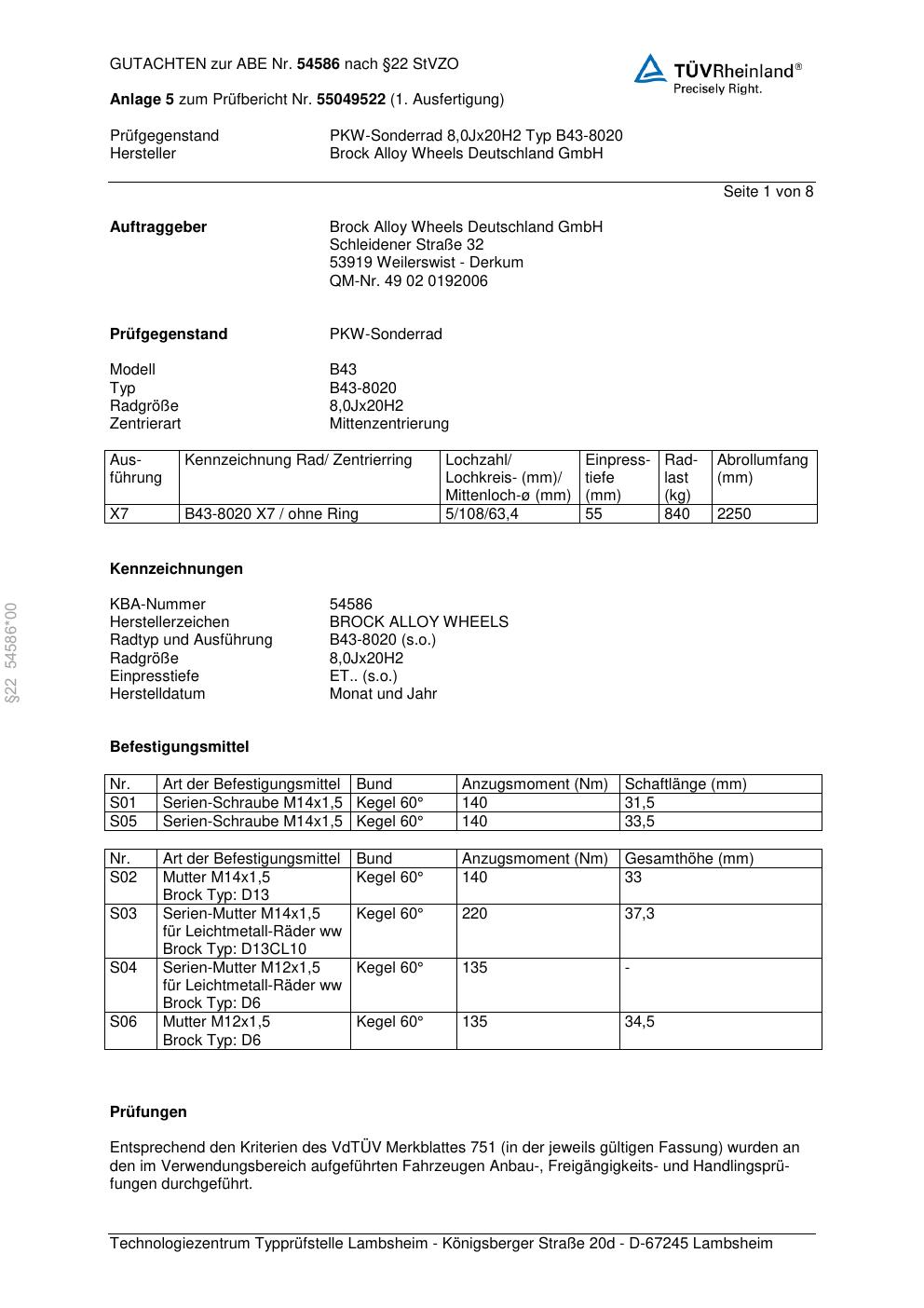 Dieses Gutachten (abe) bezieht sich auf die Alufelge Brock B43-8020 in der Ausführung 8Jx2 ET 0, Mittenloch 0 mm (KBA 54586). Im PDF findest du typischerweise zulässige Reifengrößen, Auflagen/Anbauhinweise und – je nach Dokument – Hinweise zur Eintragung.