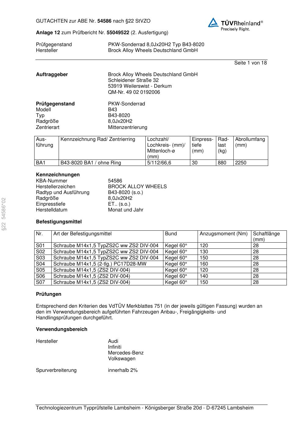 Felgengutachten / abe für Alufelgen Brock B43-8020 (8Jx2 ET 0, Mittenloch 0 mm) mit KBA 54586 (Zertifikatsnummer 54586). Hier kostenlos als PDF herunterladen. Der Download-Link ist 24 Stunden gültig und kann bis zu zwei Mal verwendet werden.