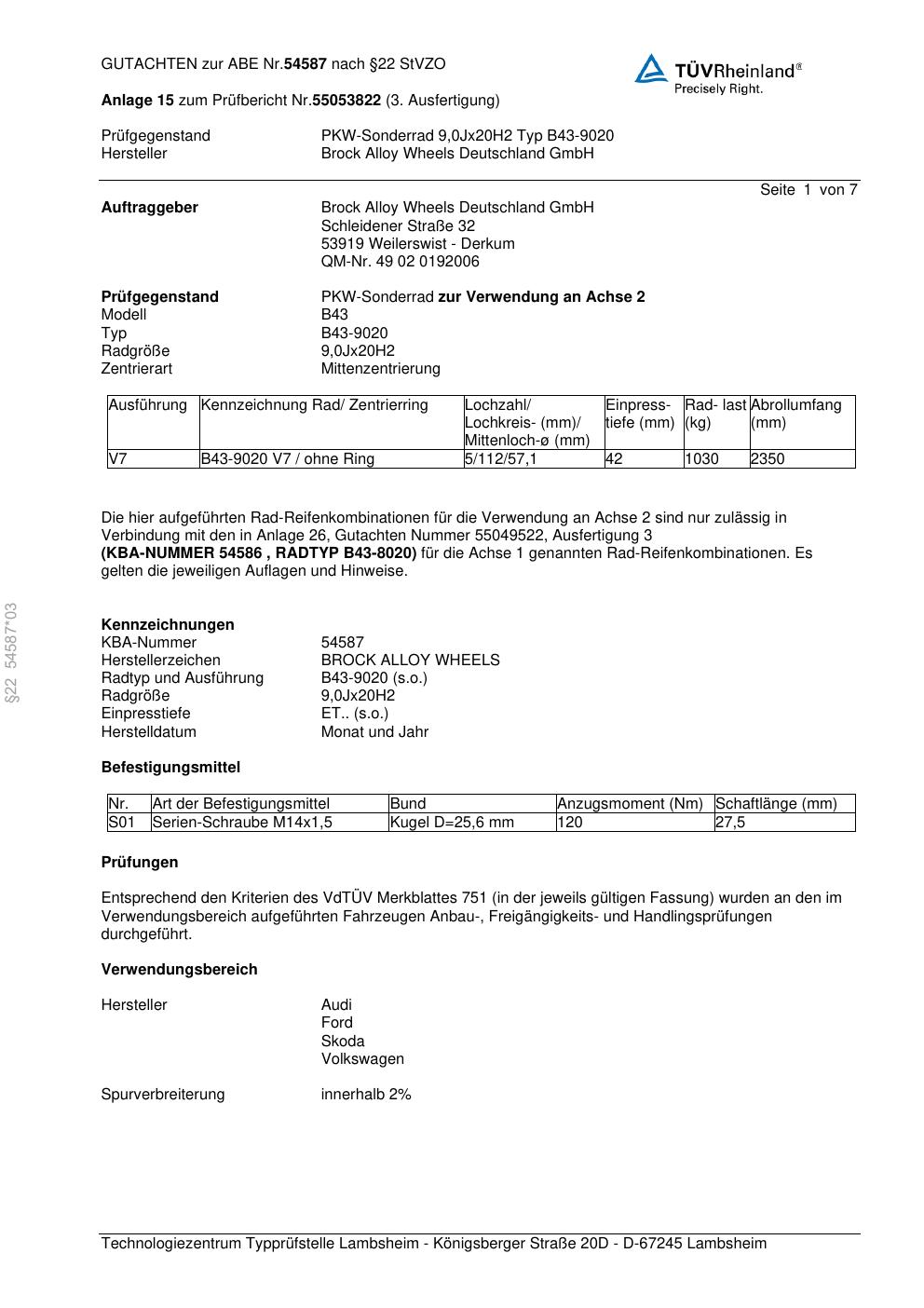 Felgengutachten / abe für Alufelgen Brock B43-9020 (9Jx2 ET 0, Mittenloch 0 mm) mit KBA 54587 (Zertifikatsnummer 54587). Hier kostenlos als PDF herunterladen. Der Download-Link ist 24 Stunden gültig und kann bis zu zwei Mal verwendet werden.