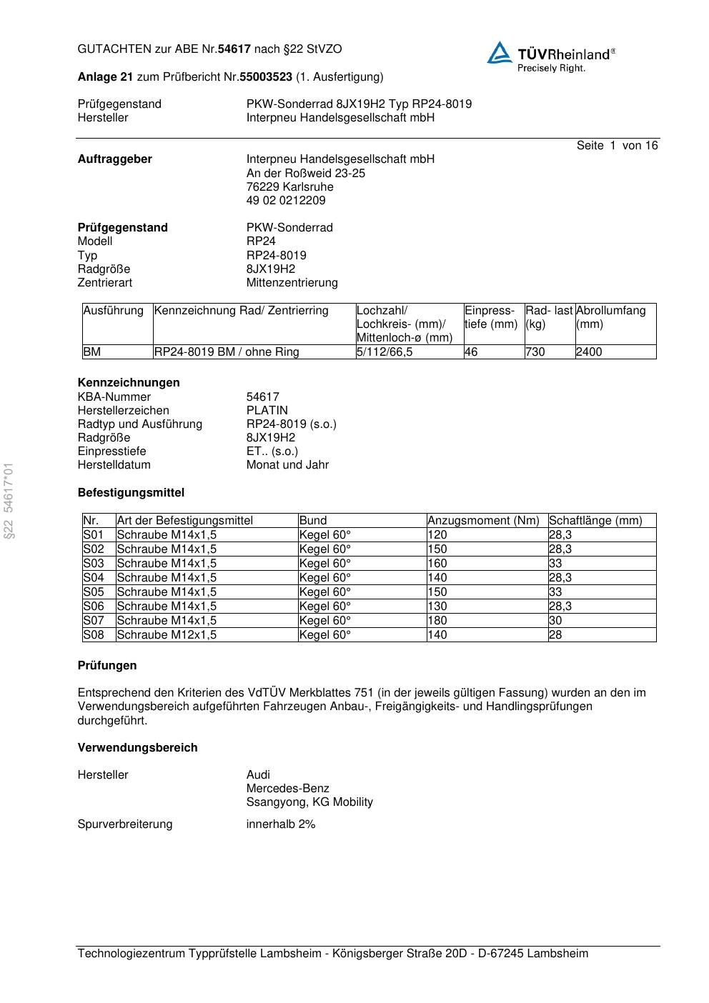 Dieses Gutachten (abe) bezieht sich auf die Alufelge Platin RP24-8019 in der Ausführung 8Jx19 ET 0, Mittenloch 0 mm (KBA 54617). Im PDF findest du typischerweise zulässige Reifengrößen, Auflagen/Anbauhinweise und – je nach Dokument – Hinweise zur Eintragung.