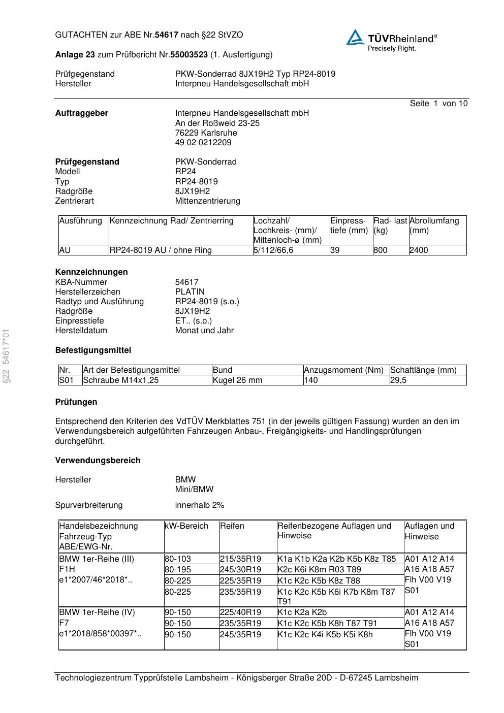 Dieses Gutachten (abe) bezieht sich auf die Alufelge Platin RP24-8019 in der Ausführung 8Jx19 ET 0, Mittenloch 0 mm (KBA 54617). Im PDF findest du typischerweise zulässige Reifengrößen, Auflagen/Anbauhinweise und – je nach Dokument – Hinweise zur Eintragung.
