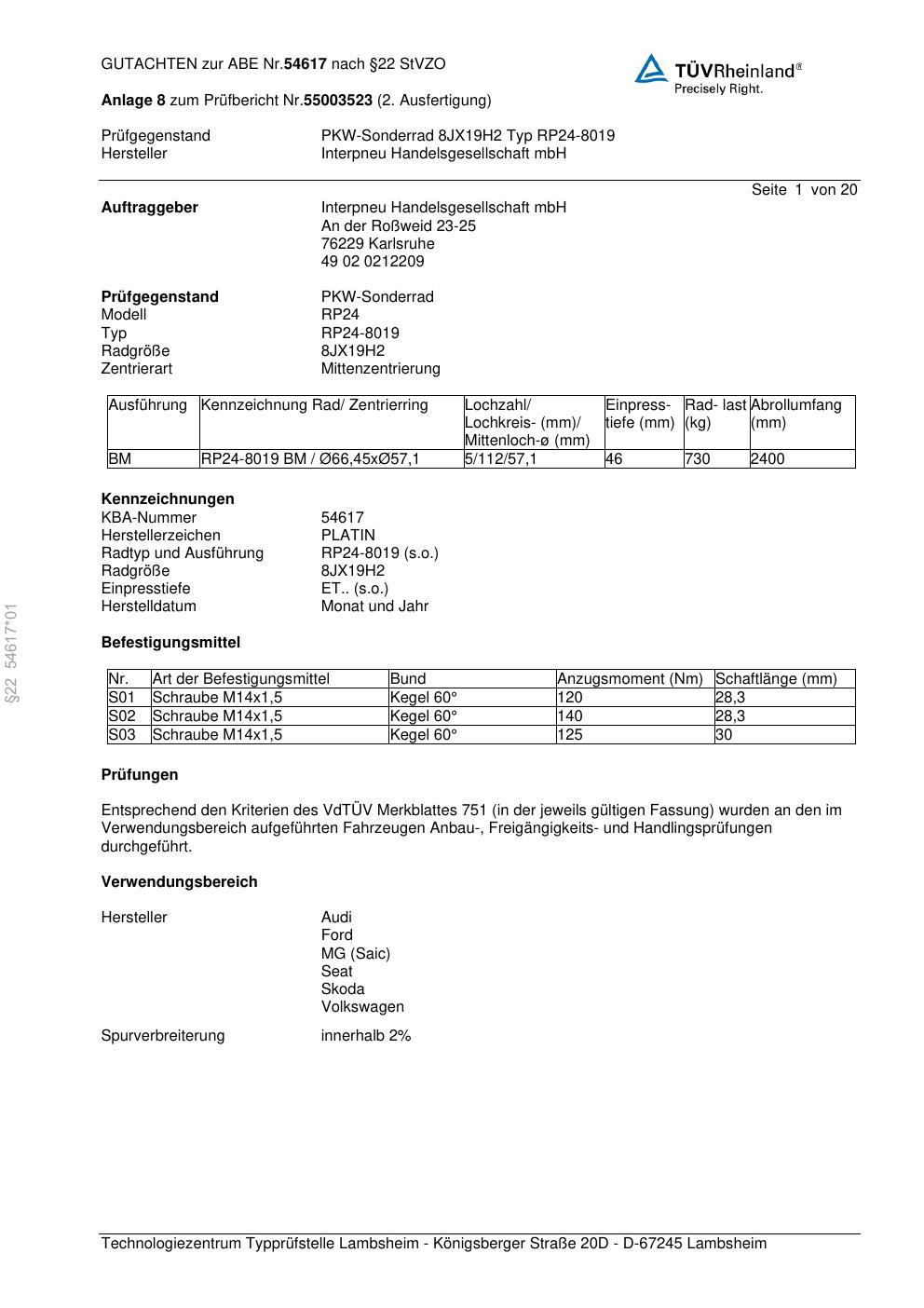 Dieses Gutachten (abe) bezieht sich auf die Alufelge Platin RP24-8019 in der Ausführung 8Jx19 ET 0, Mittenloch 0 mm (KBA 54617). Im PDF findest du typischerweise zulässige Reifengrößen, Auflagen/Anbauhinweise und – je nach Dokument – Hinweise zur Eintragung.