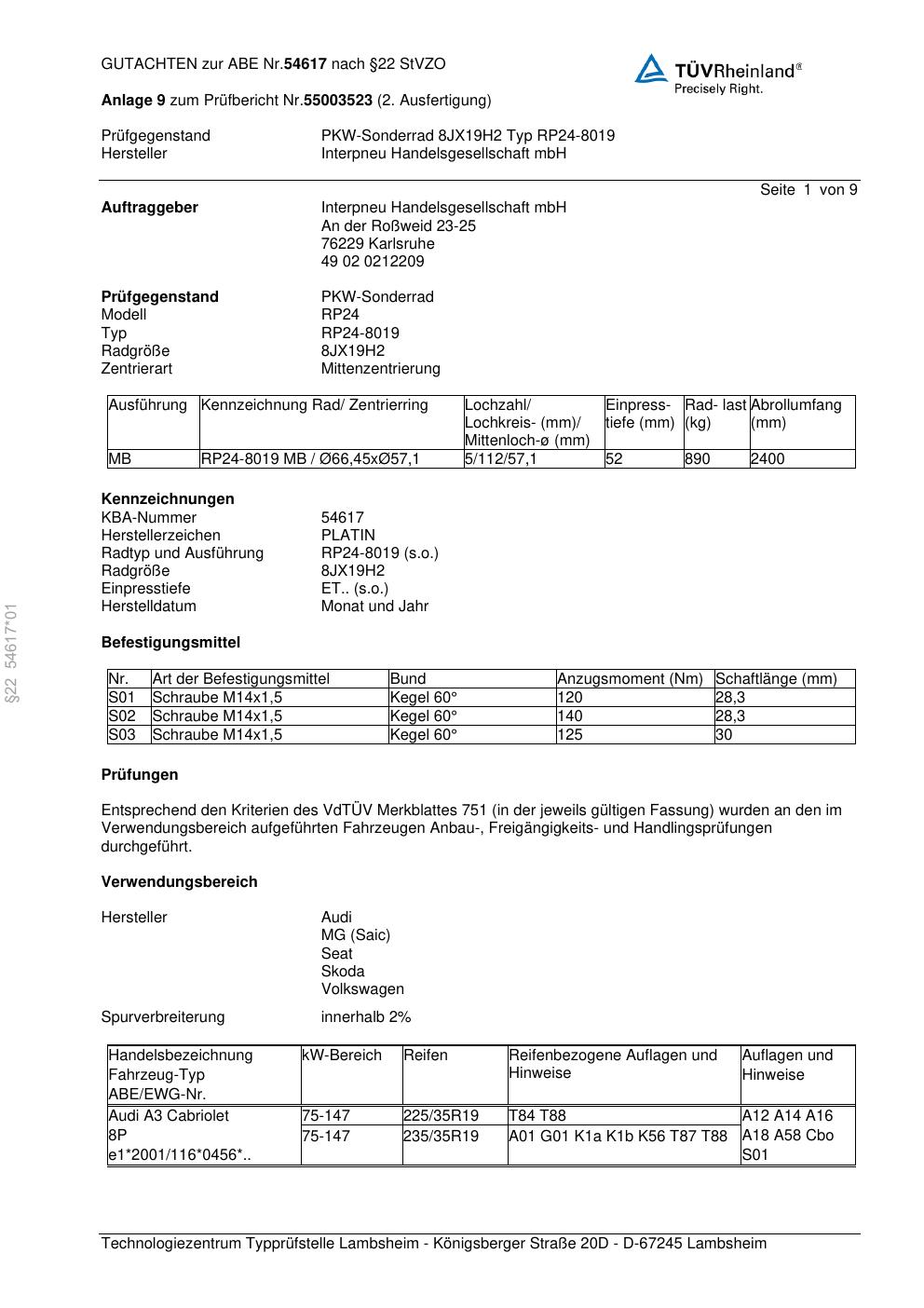 Felgengutachten / abe für Alufelgen Platin RP24-8019 (8Jx19 ET 0, Mittenloch 0 mm) mit KBA 54617 (Zertifikatsnummer 54617). Hier kostenlos als PDF herunterladen. Der Download-Link ist 24 Stunden gültig und kann bis zu zwei Mal verwendet werden.
