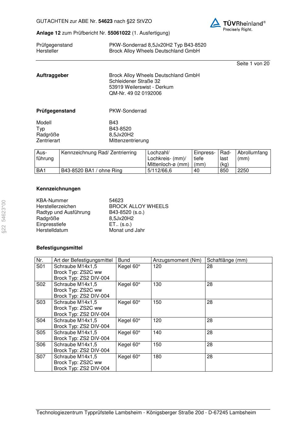 Dieses Gutachten (abe) bezieht sich auf die Alufelge Brock B43-8520 in der Ausführung 8.5Jx2 ET 0, Mittenloch 0 mm (KBA 54623). Im PDF findest du typischerweise zulässige Reifengrößen, Auflagen/Anbauhinweise und – je nach Dokument – Hinweise zur Eintragung.
