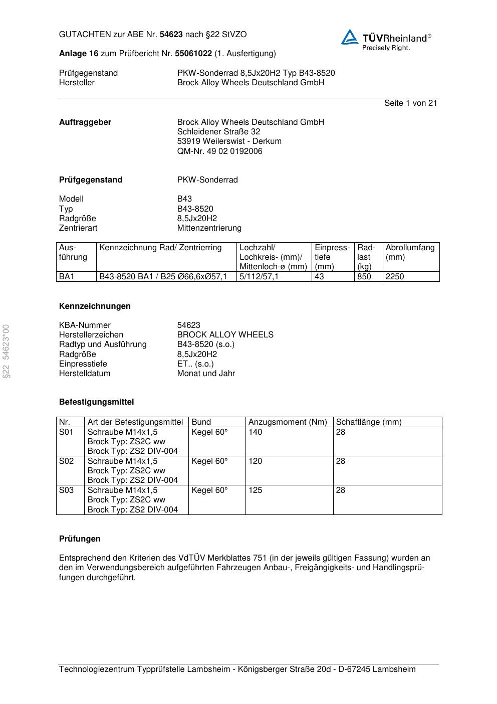Dieses Gutachten (abe) bezieht sich auf die Alufelge Brock B43-8520 in der Ausführung 8.5Jx2 ET 0, Mittenloch 0 mm (KBA 54623). Im PDF findest du typischerweise zulässige Reifengrößen, Auflagen/Anbauhinweise und – je nach Dokument – Hinweise zur Eintragung.