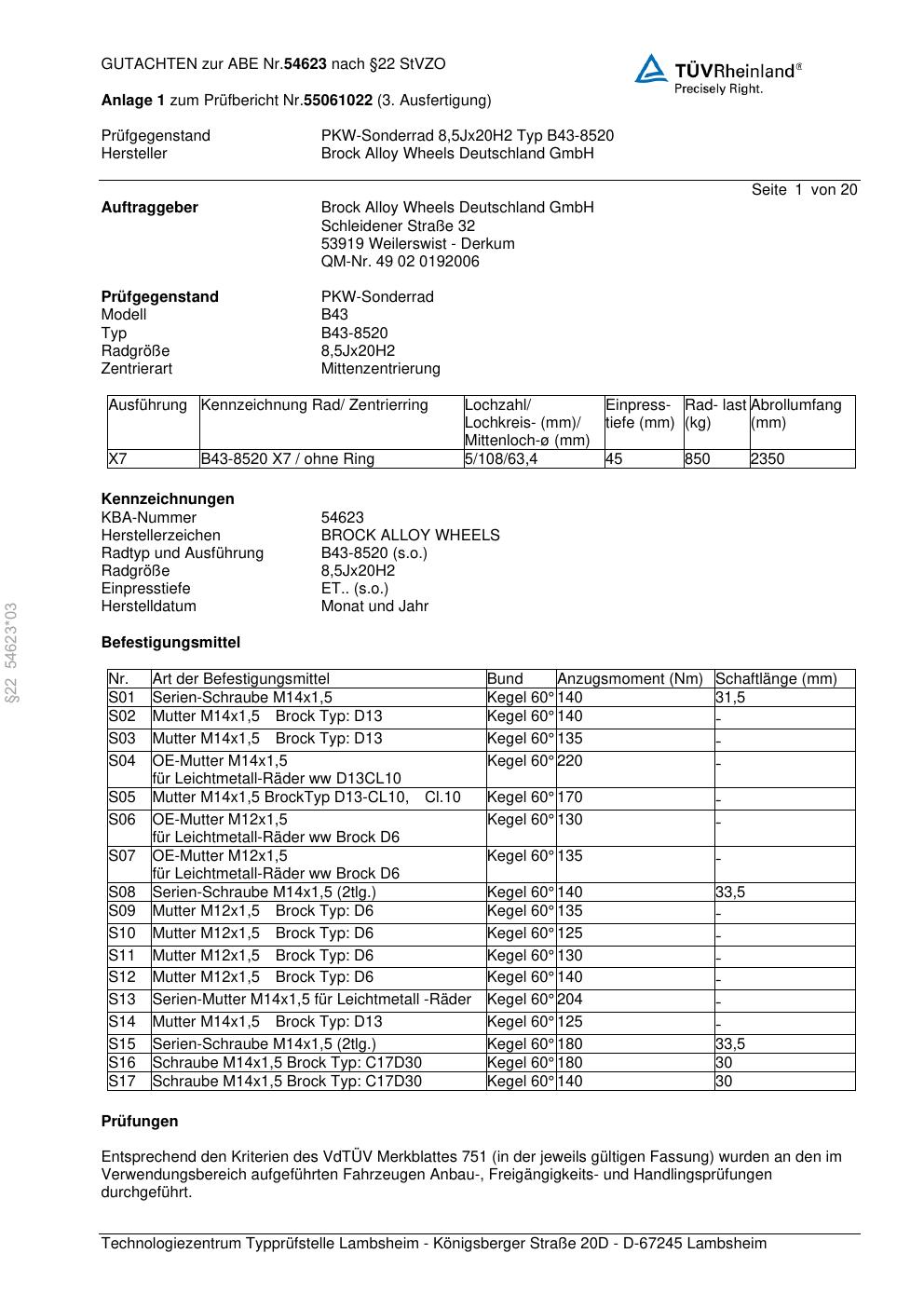 Dieses Gutachten (abe) bezieht sich auf die Alufelge Brock B43-8520 in der Ausführung 8.5Jx2 ET 0, Mittenloch 0 mm (KBA 54623). Im PDF findest du typischerweise zulässige Reifengrößen, Auflagen/Anbauhinweise und – je nach Dokument – Hinweise zur Eintragung.