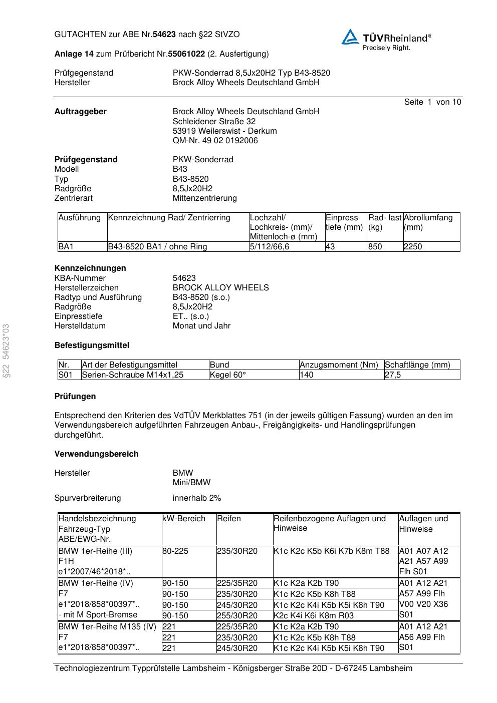 Dieses Gutachten (abe) bezieht sich auf die Alufelge Brock B43-8520 in der Ausführung 8.5Jx2 ET 0, Mittenloch 0 mm (KBA 54623). Im PDF findest du typischerweise zulässige Reifengrößen, Auflagen/Anbauhinweise und – je nach Dokument – Hinweise zur Eintragung.