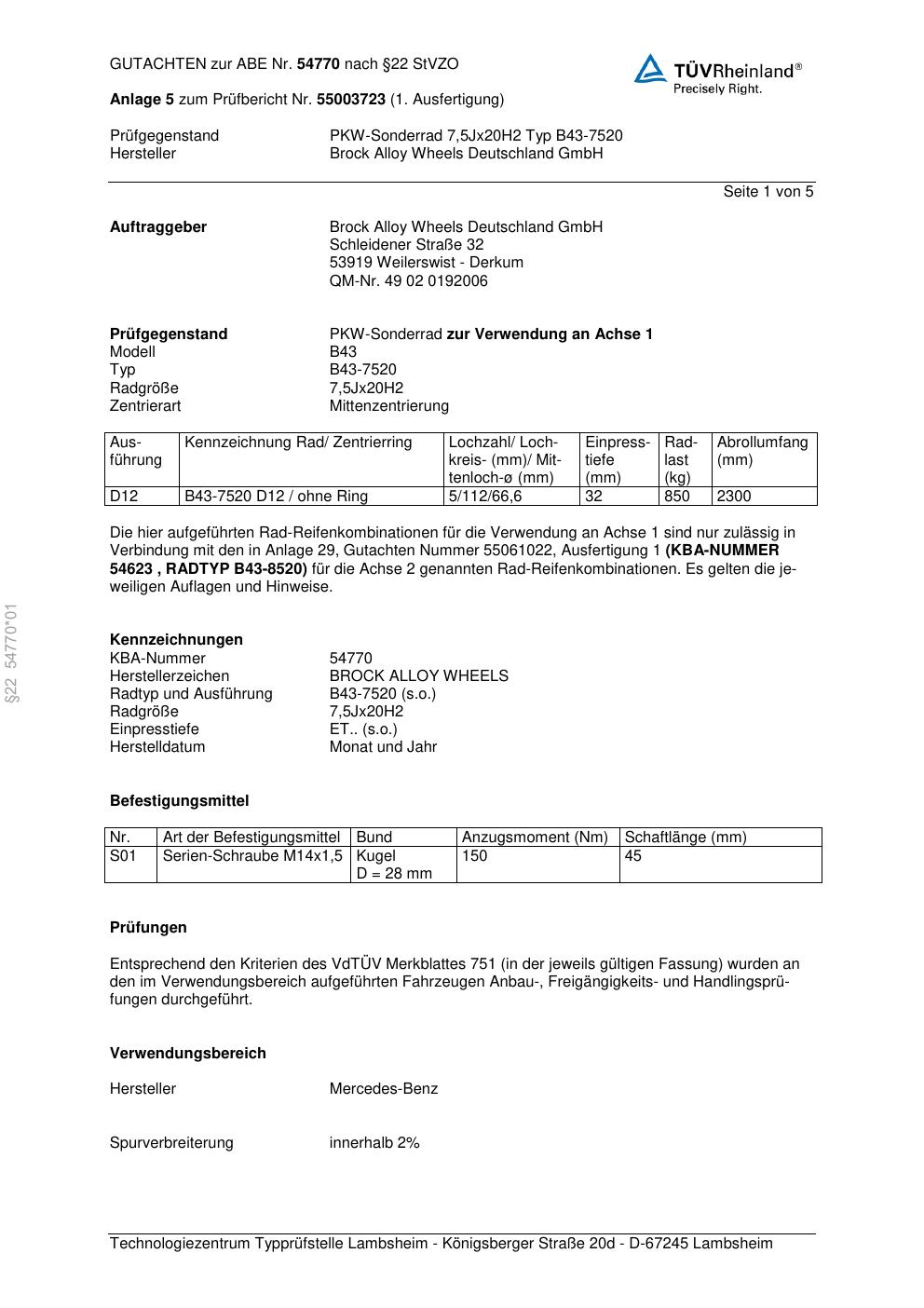 Felgengutachten / abe für Alufelgen Brock B43-7520 (7.5Jx2 ET 0, Mittenloch 0 mm) mit KBA 54770 (Zertifikatsnummer 54770). Hier kostenlos als PDF herunterladen. Der Download-Link ist 24 Stunden gültig und kann bis zu zwei Mal verwendet werden.