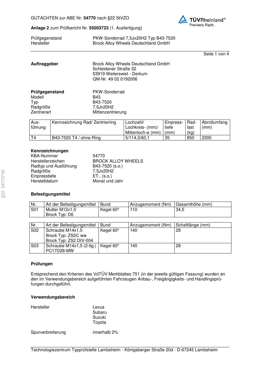 Felgengutachten / abe für Alufelgen Brock B43-7520 (7.5Jx2 ET 0, Mittenloch 0 mm) mit KBA 54770 (Zertifikatsnummer 54770). Hier kostenlos als PDF herunterladen. Der Download-Link ist 24 Stunden gültig und kann bis zu zwei Mal verwendet werden.