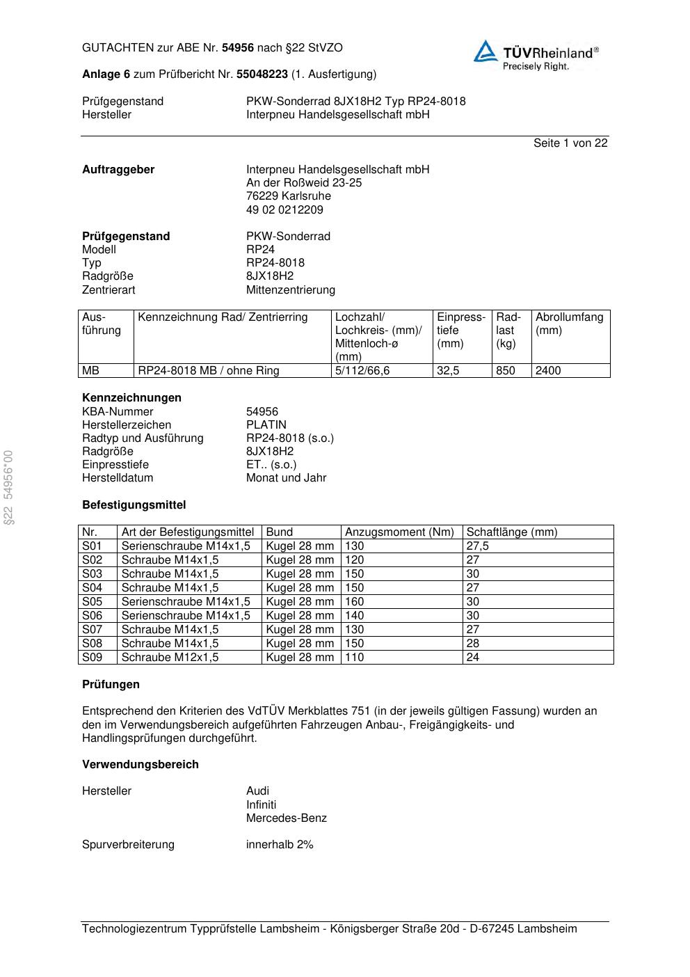 Felgengutachten / abe für Alufelgen Platin RP24-8018 (8Jx18 ET 0, Mittenloch 0 mm) mit KBA 54956 (Zertifikatsnummer 54956). Hier kostenlos als PDF herunterladen. Der Download-Link ist 24 Stunden gültig und kann bis zu zwei Mal verwendet werden.