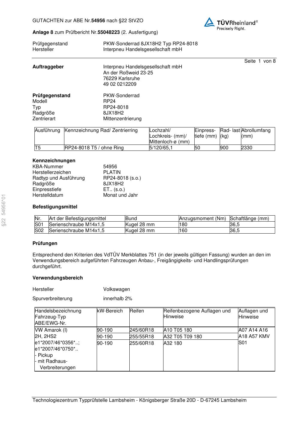 Dieses Gutachten (abe) bezieht sich auf die Alufelge Platin RP24-8018 in der Ausführung 8Jx18 ET 0, Mittenloch 0 mm (KBA 54956). Im PDF findest du typischerweise zulässige Reifengrößen, Auflagen/Anbauhinweise und – je nach Dokument – Hinweise zur Eintragung.
