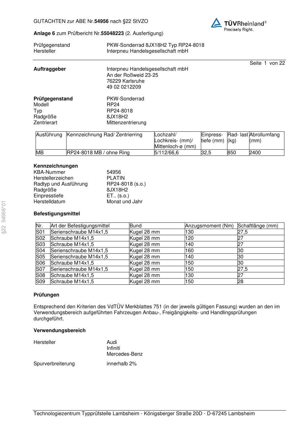 Dieses Gutachten (abe) bezieht sich auf die Alufelge Platin RP24-8018 in der Ausführung 8Jx18 ET 0, Mittenloch 0 mm (KBA 54956). Im PDF findest du typischerweise zulässige Reifengrößen, Auflagen/Anbauhinweise und – je nach Dokument – Hinweise zur Eintragung.