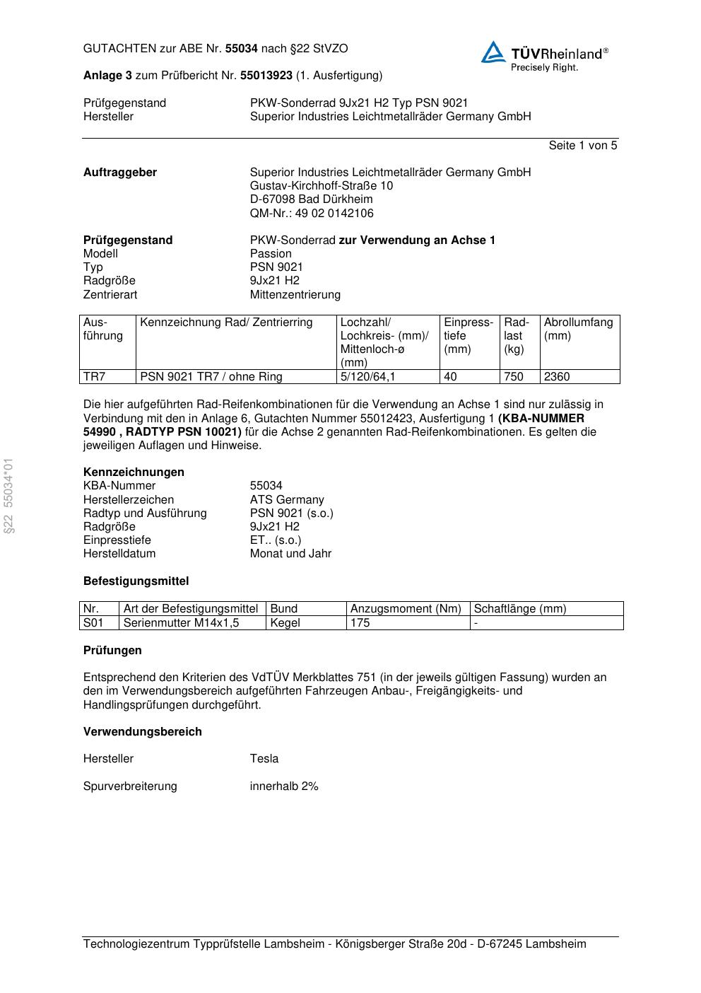 Dieses Gutachten (abe) bezieht sich auf die Alufelge ATS PSN 9021 in der Ausführung 9Jx21 ET 0, Mittenloch 0 mm (KBA 55034). Im PDF findest du typischerweise zulässige Reifengrößen, Auflagen/Anbauhinweise und – je nach Dokument – Hinweise zur Eintragung.