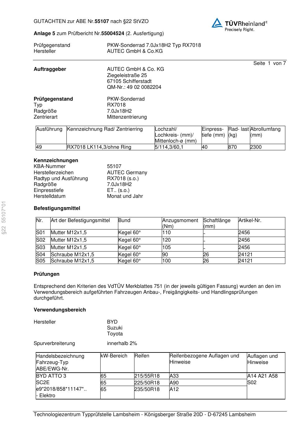 Dieses Gutachten (abe) bezieht sich auf die Alufelge Autec RX7018 in der Ausführung 7Jx18 ET 0, Mittenloch 0 mm (KBA 55107). Im PDF findest du typischerweise zulässige Reifengrößen, Auflagen/Anbauhinweise und – je nach Dokument – Hinweise zur Eintragung.
