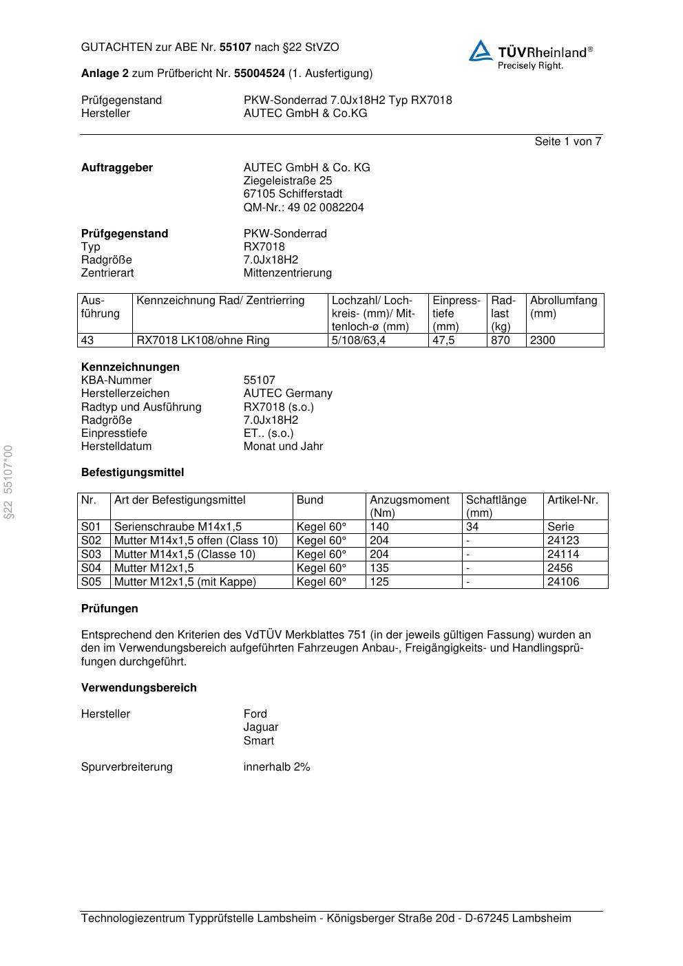 Dieses Gutachten (abe) bezieht sich auf die Alufelge Autec RX7018 in der Ausführung 7Jx18 ET 0, Mittenloch 0 mm (KBA 55107). Im PDF findest du typischerweise zulässige Reifengrößen, Auflagen/Anbauhinweise und – je nach Dokument – Hinweise zur Eintragung.