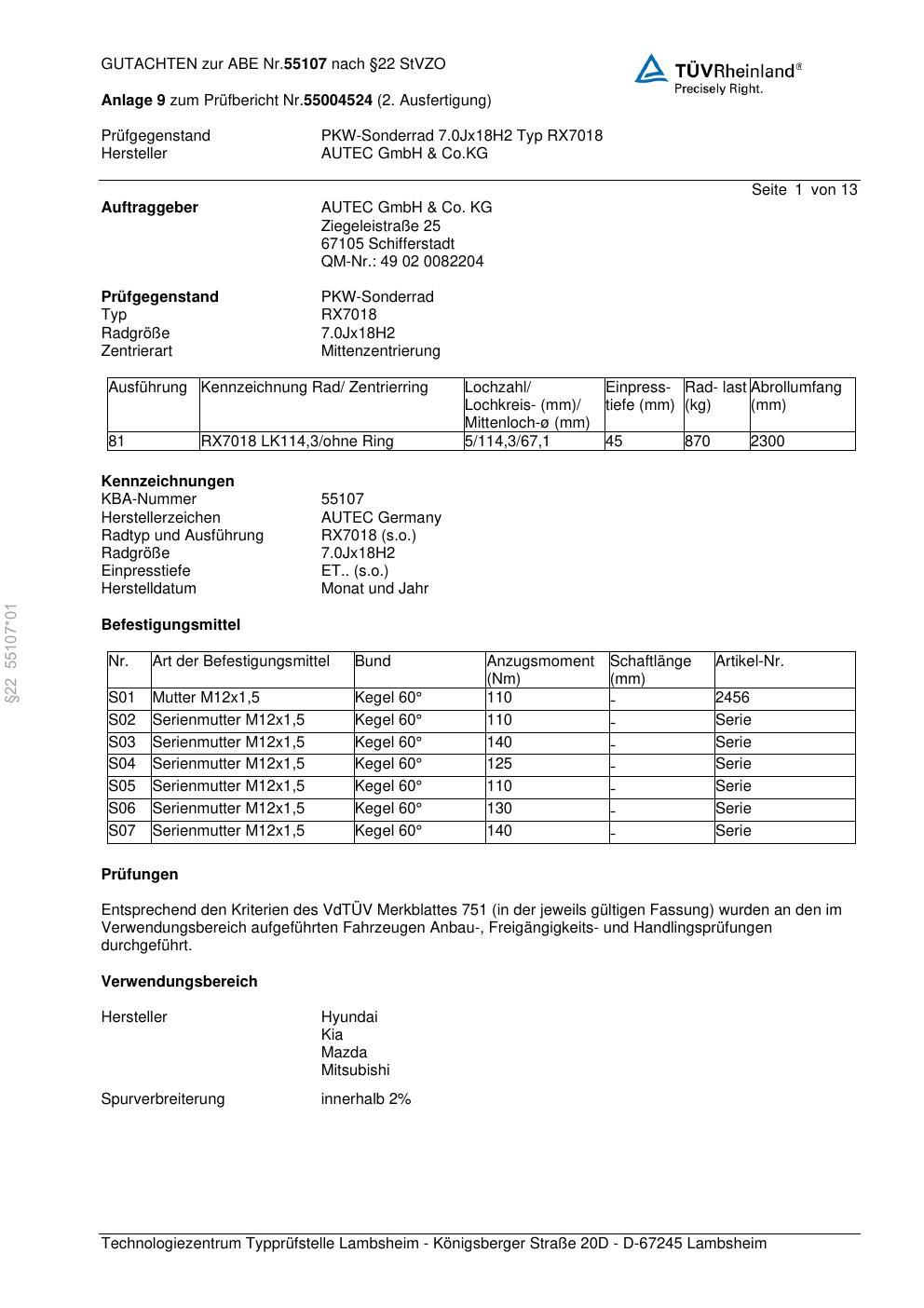 Dieses Gutachten (abe) bezieht sich auf die Alufelge Autec RX7018 in der Ausführung 7Jx18 ET 0, Mittenloch 0 mm (KBA 55107). Im PDF findest du typischerweise zulässige Reifengrößen, Auflagen/Anbauhinweise und – je nach Dokument – Hinweise zur Eintragung.