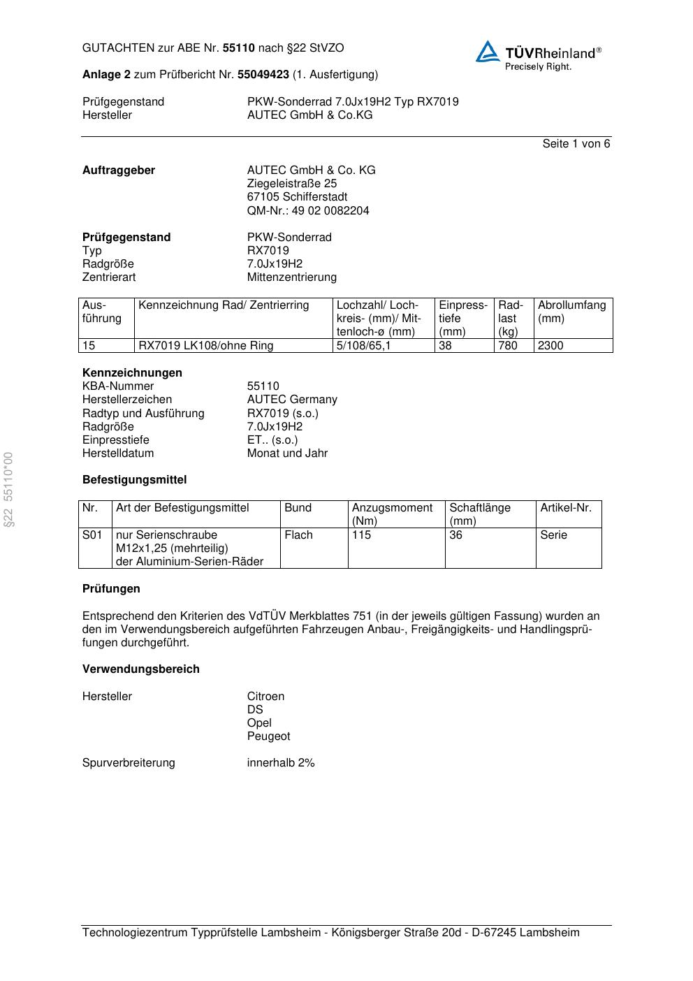 Felgengutachten / abe für Alufelgen brand-autec RX7019 (7Jx19 ET 0, Mittenloch 0 mm) mit KBA 55110 (Zertifikatsnummer 55110). Hier kostenlos als PDF herunterladen. Der Download-Link ist 24 Stunden gültig und kann bis zu zwei Mal verwendet werden.