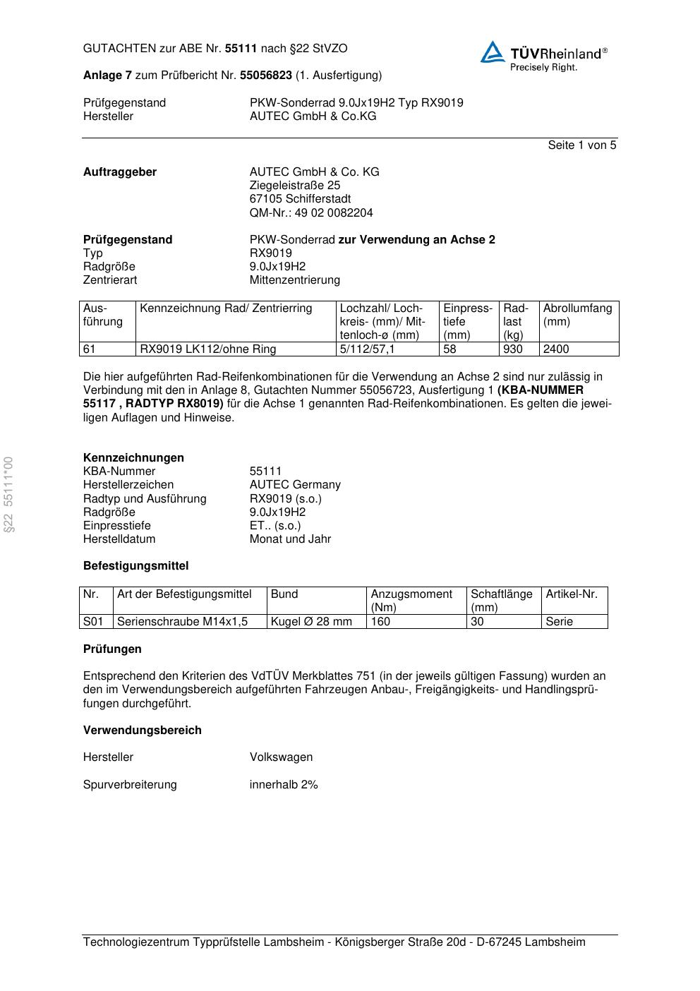 Felgengutachten / abe für Alufelgen Autec RX9019 (9Jx19 ET 0, Mittenloch 0 mm) mit KBA 55111 (Zertifikatsnummer 55111). Hier kostenlos als PDF herunterladen. Der Download-Link ist 24 Stunden gültig und kann bis zu zwei Mal verwendet werden.