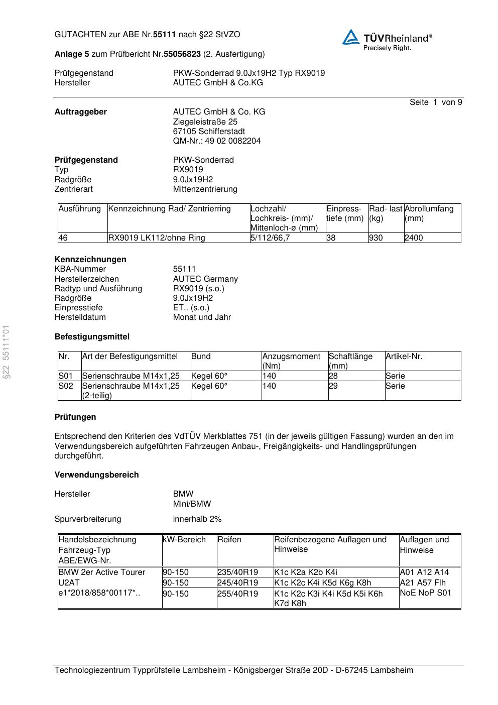 Dieses Gutachten (abe) bezieht sich auf die Alufelge Autec RX9019 in der Ausführung 9Jx19 ET 0, Mittenloch 0 mm (KBA 55111). Im PDF findest du typischerweise zulässige Reifengrößen, Auflagen/Anbauhinweise und – je nach Dokument – Hinweise zur Eintragung.