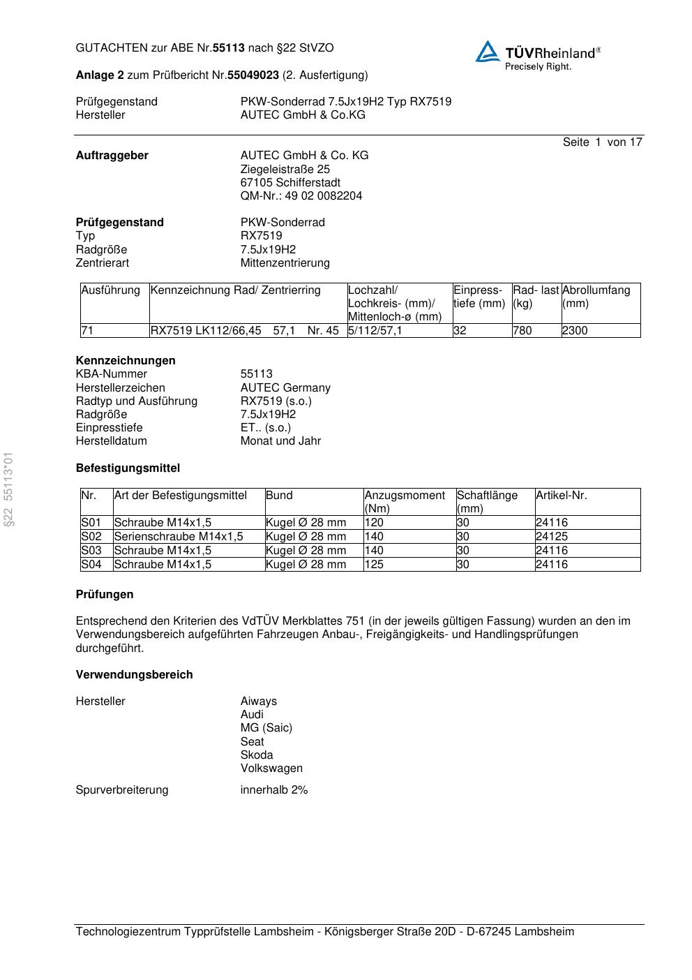 Dieses Gutachten (abe) bezieht sich auf die Alufelge Autec RX7519 in der Ausführung 7.5Jx19 ET 0, Mittenloch 0 mm (KBA 55113). Im PDF findest du typischerweise zulässige Reifengrößen, Auflagen/Anbauhinweise und – je nach Dokument – Hinweise zur Eintragung.