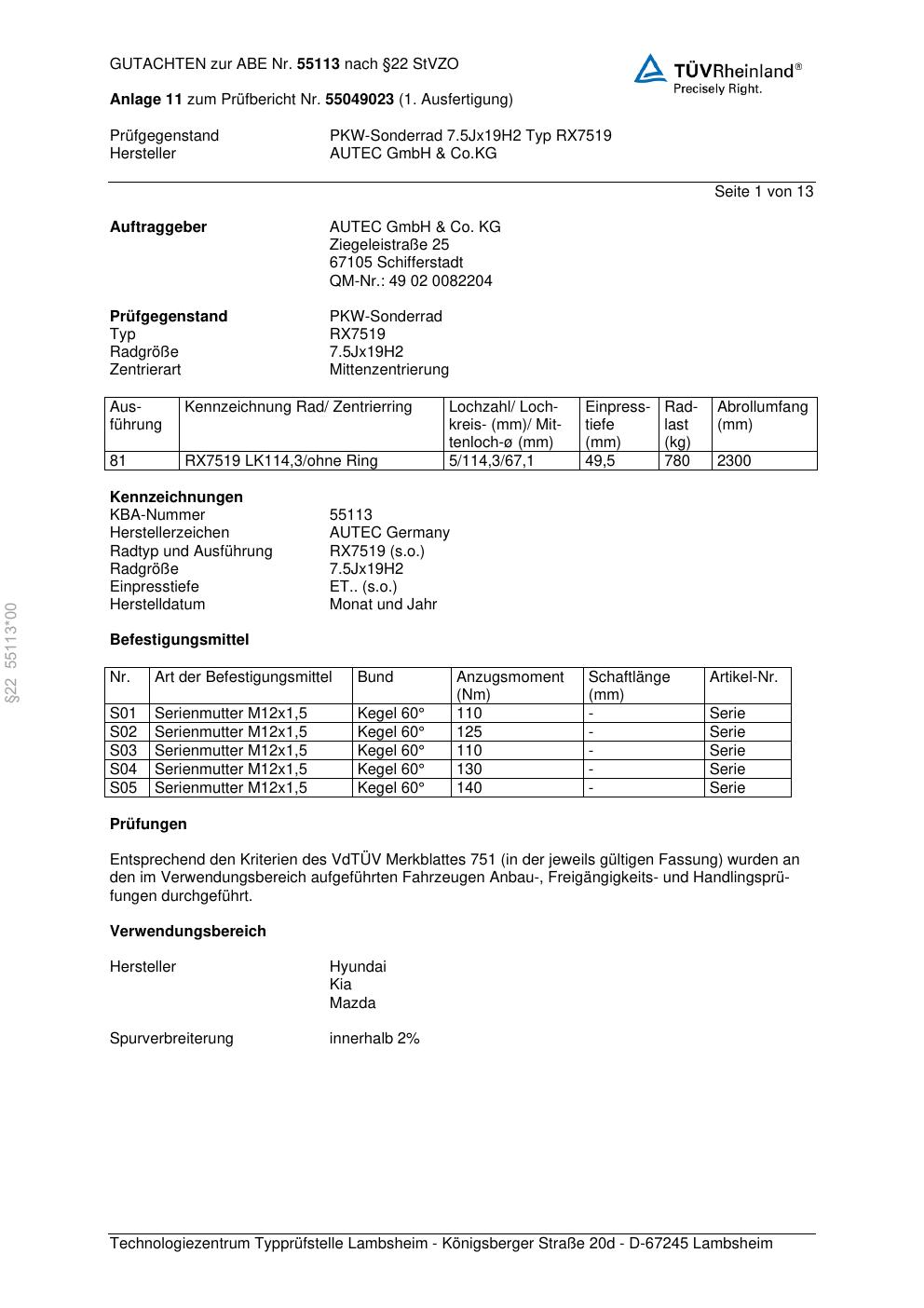 Dieses Gutachten (abe) bezieht sich auf die Alufelge Autec RX7519 in der Ausführung 7.5Jx19 ET 0, Mittenloch 0 mm (KBA 55113). Im PDF findest du typischerweise zulässige Reifengrößen, Auflagen/Anbauhinweise und – je nach Dokument – Hinweise zur Eintragung.