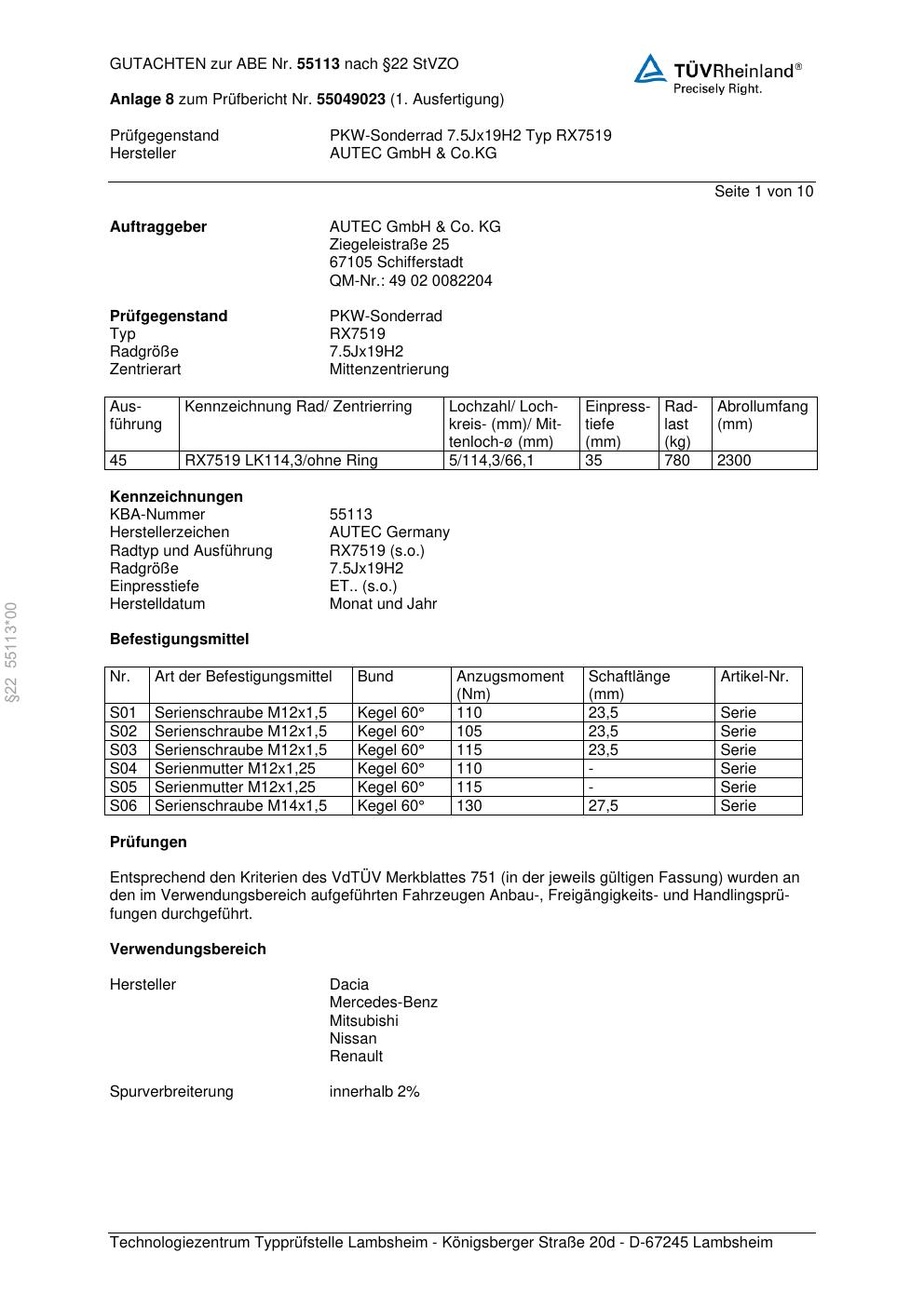 Dieses Gutachten (abe) bezieht sich auf die Alufelge Autec RX7519 in der Ausführung 7.5Jx19 ET 0, Mittenloch 0 mm (KBA 55113). Im PDF findest du typischerweise zulässige Reifengrößen, Auflagen/Anbauhinweise und – je nach Dokument – Hinweise zur Eintragung.