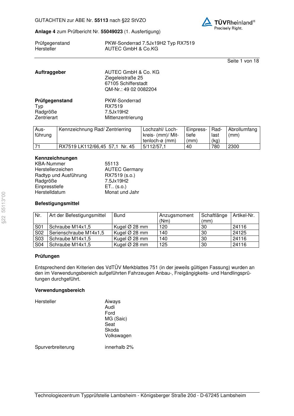 Dieses Gutachten (abe) bezieht sich auf die Alufelge Autec RX7519 in der Ausführung 7.5Jx19 ET 0, Mittenloch 0 mm (KBA 55113). Im PDF findest du typischerweise zulässige Reifengrößen, Auflagen/Anbauhinweise und – je nach Dokument – Hinweise zur Eintragung.