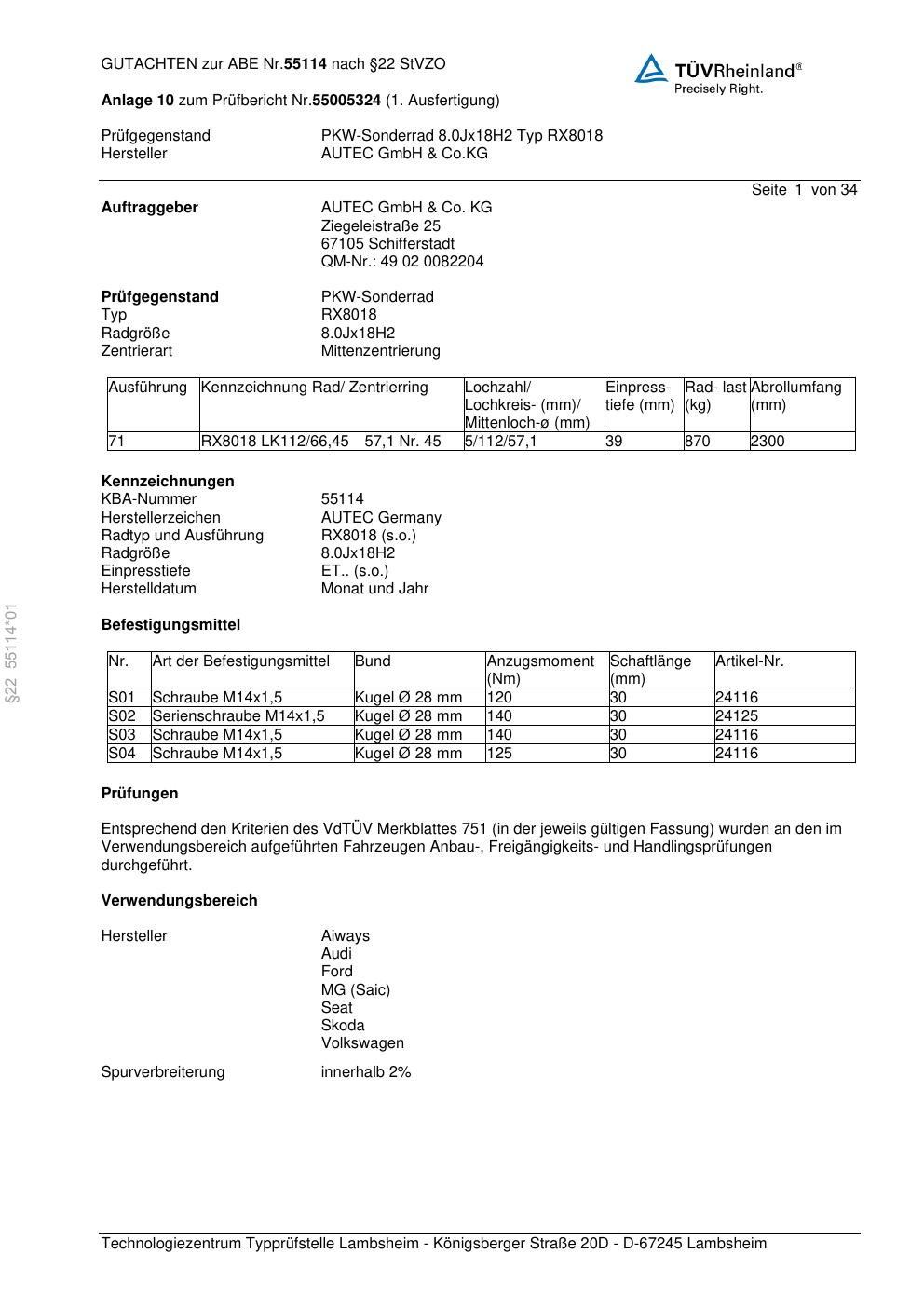Felgengutachten / abe für Alufelgen Autec RX8018 (8Jx18 ET 0, Mittenloch 0 mm) mit KBA 55114 (Zertifikatsnummer 55114). Hier kostenlos als PDF herunterladen. Der Download-Link ist 24 Stunden gültig und kann bis zu zwei Mal verwendet werden.