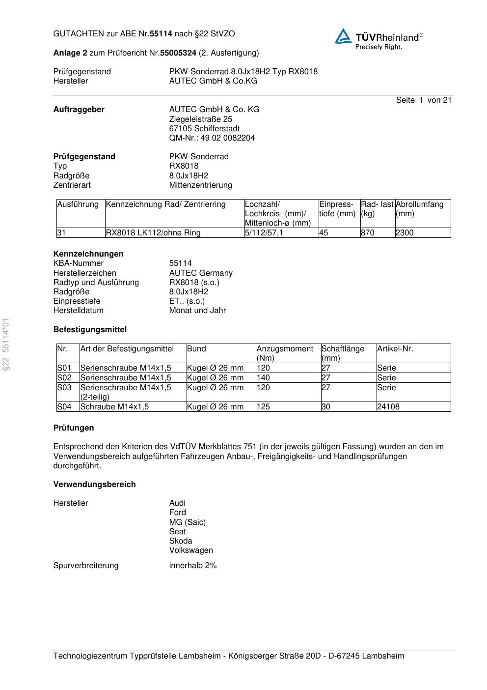 Felgengutachten / abe für Alufelgen Autec RX8018 (8Jx18 ET 0, Mittenloch 0 mm) mit KBA 55114 (Zertifikatsnummer 55114). Hier kostenlos als PDF herunterladen. Der Download-Link ist 24 Stunden gültig und kann bis zu zwei Mal verwendet werden.