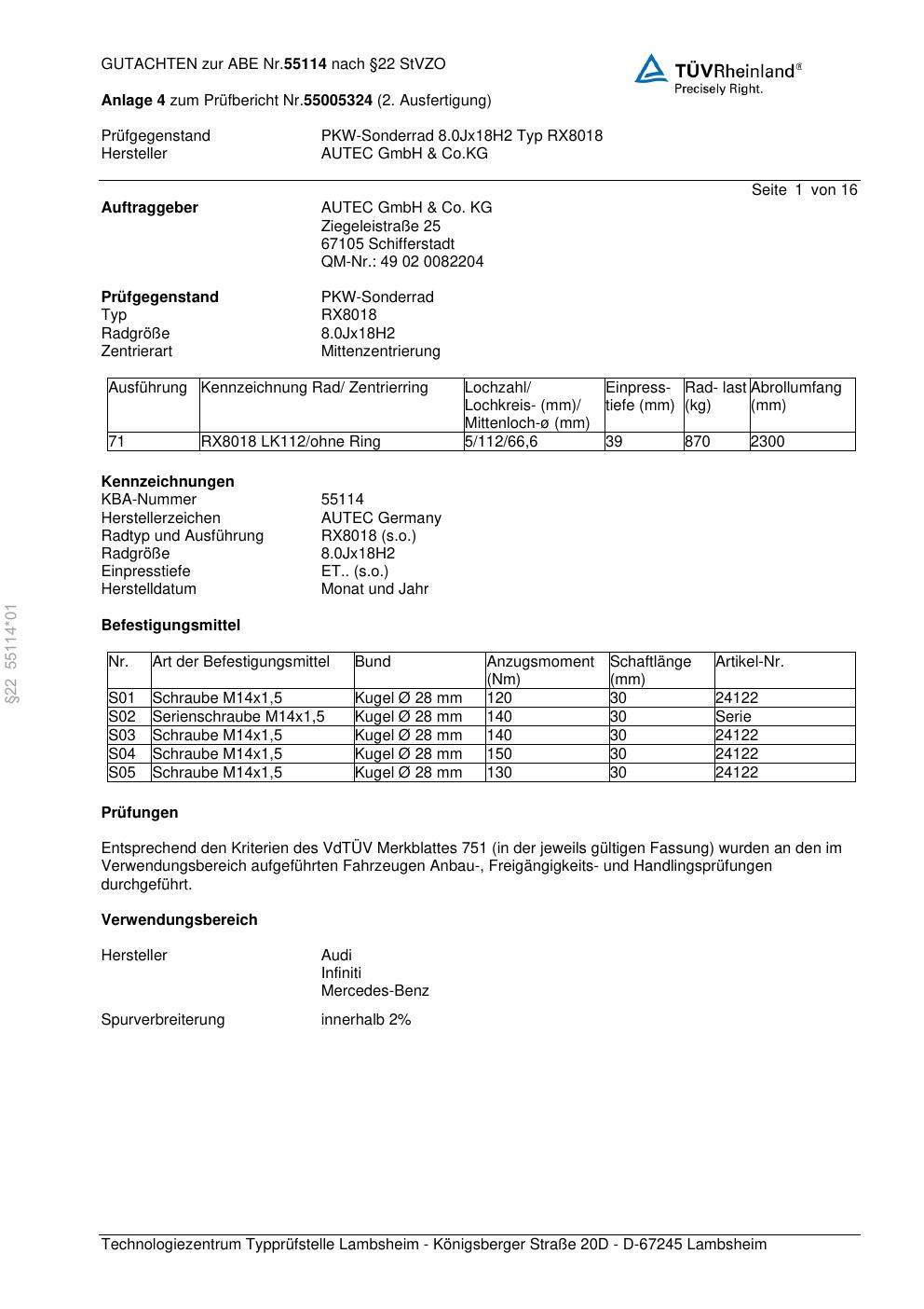 Dieses Gutachten (abe) bezieht sich auf die Alufelge Autec RX8018 in der Ausführung 8Jx18 ET 0, Mittenloch 0 mm (KBA 55114). Im PDF findest du typischerweise zulässige Reifengrößen, Auflagen/Anbauhinweise und – je nach Dokument – Hinweise zur Eintragung.