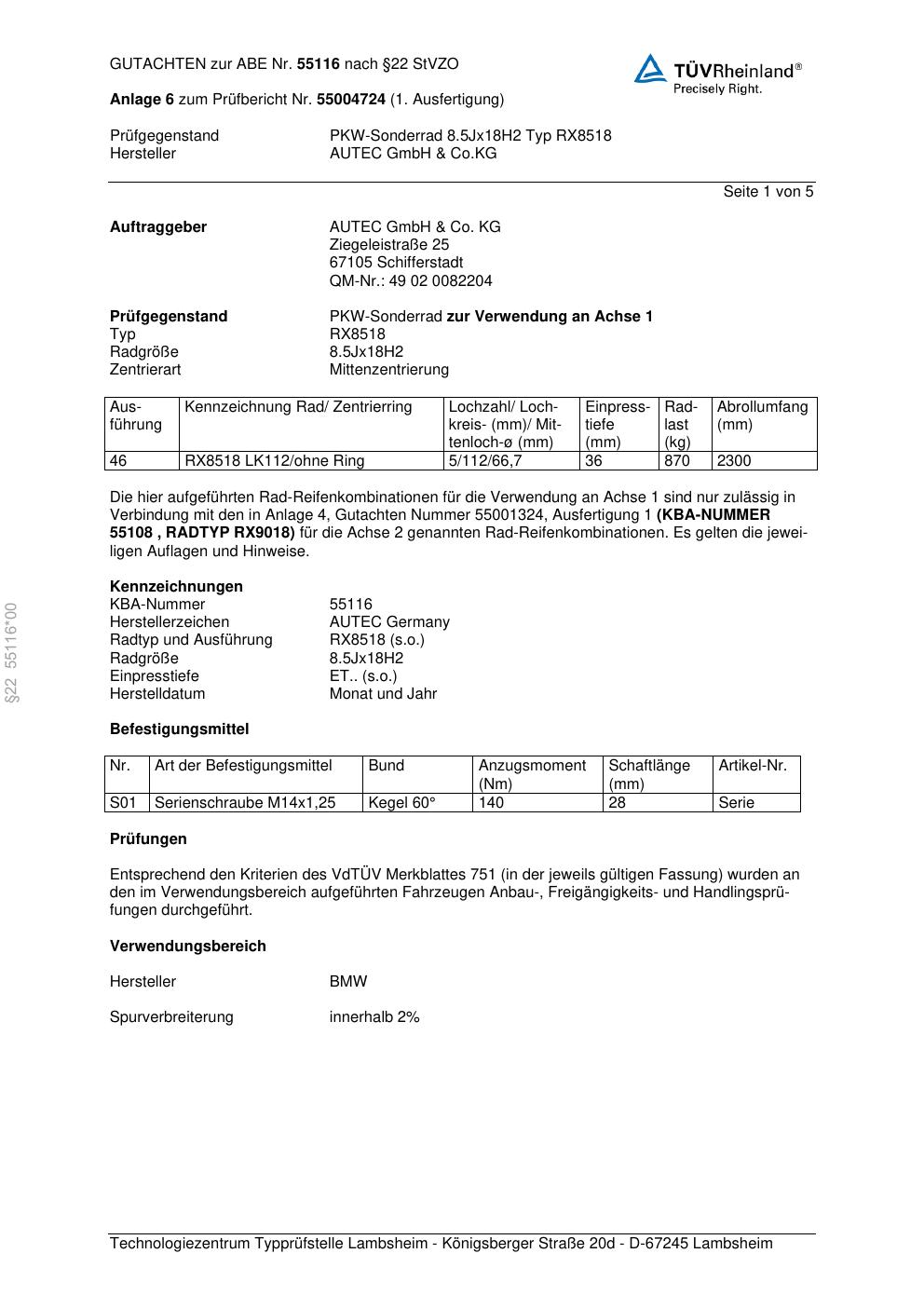 Dieses Gutachten (abe) bezieht sich auf die Alufelge Autec RX8518 in der Ausführung 8.5Jx18 ET 0, Mittenloch 0 mm (KBA 55116). Im PDF findest du typischerweise zulässige Reifengrößen, Auflagen/Anbauhinweise und – je nach Dokument – Hinweise zur Eintragung.