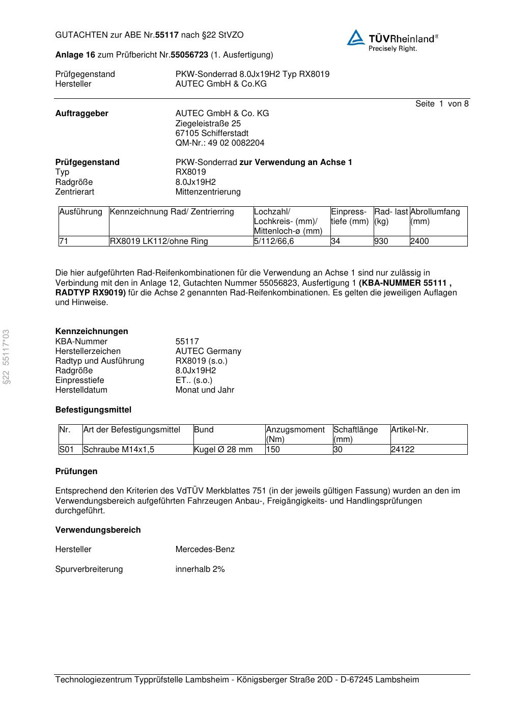 Dieses Gutachten (abe) bezieht sich auf die Alufelge Autec RX8019 in der Ausführung 8Jx19 ET 0, Mittenloch 0 mm (KBA 55117). Im PDF findest du typischerweise zulässige Reifengrößen, Auflagen/Anbauhinweise und – je nach Dokument – Hinweise zur Eintragung.