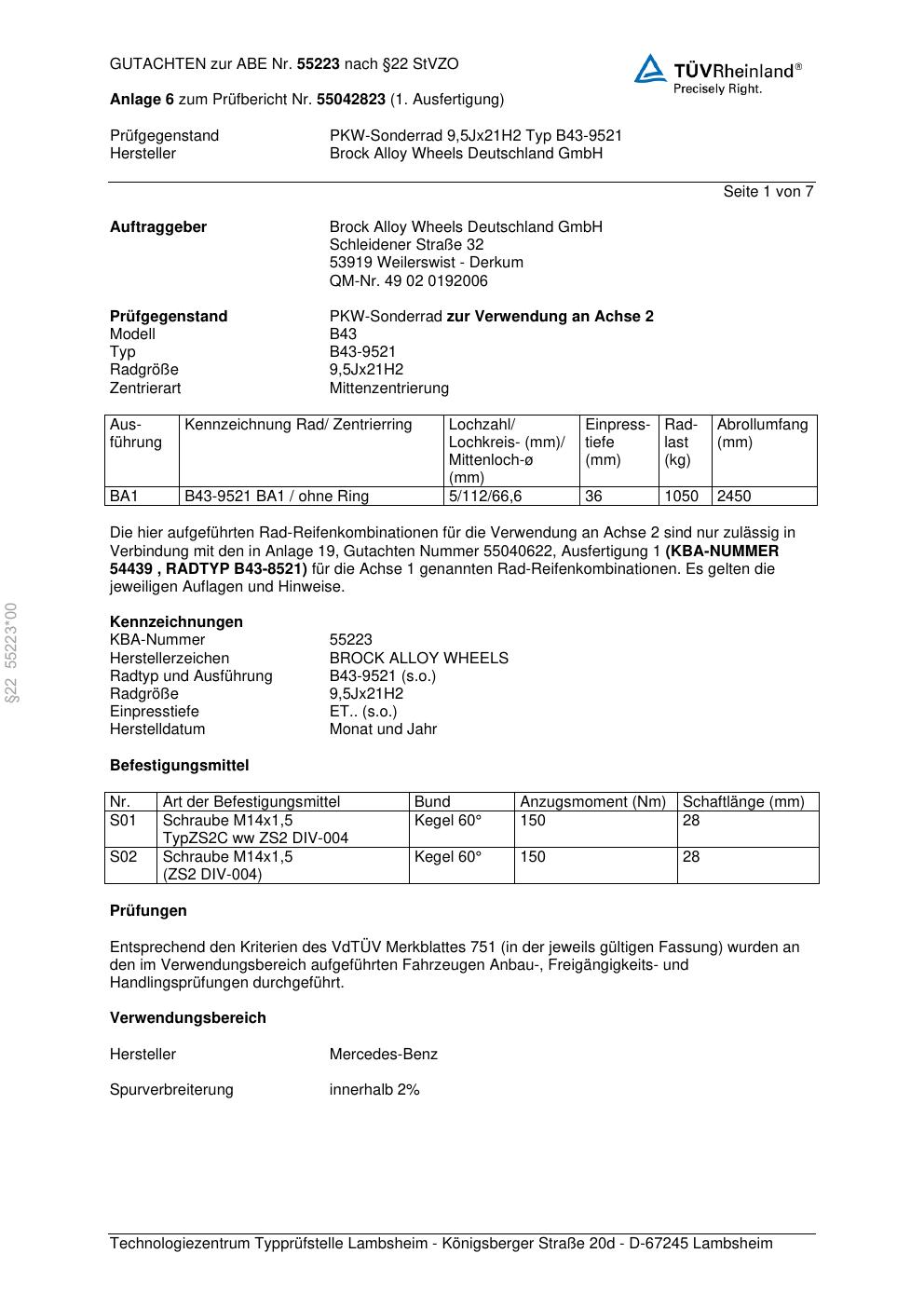Dieses Gutachten (abe) bezieht sich auf die Alufelge Brock B43-9521 in der Ausführung 9.5Jx21 ET 0, Mittenloch 0 mm (KBA 55223). Im PDF findest du typischerweise zulässige Reifengrößen, Auflagen/Anbauhinweise und – je nach Dokument – Hinweise zur Eintragung.