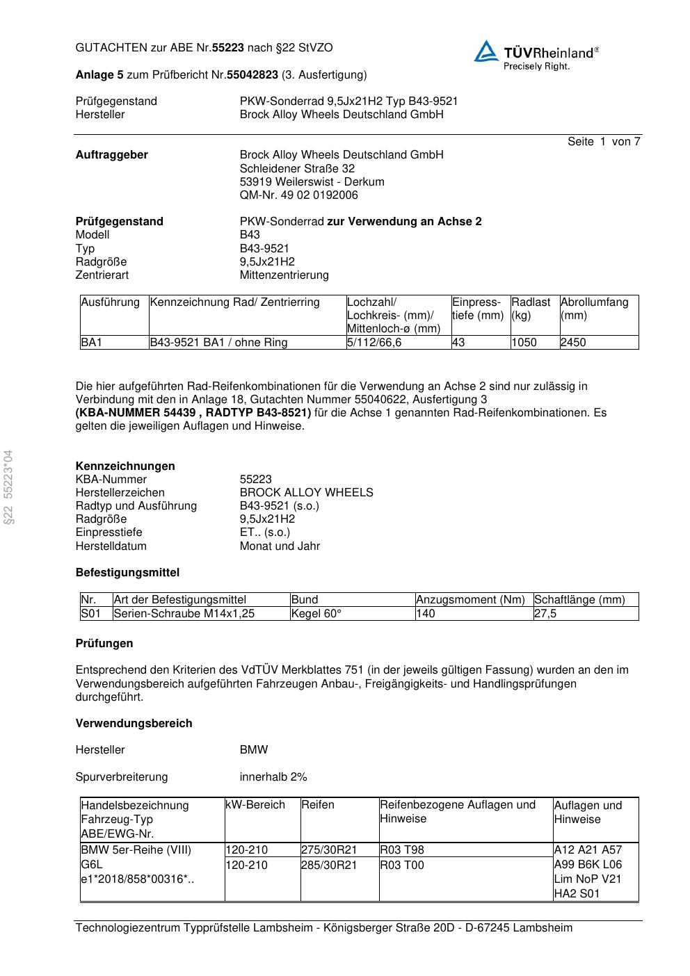 Dieses Gutachten (abe) bezieht sich auf die Alufelge Brock B43-9521 in der Ausführung 9.5Jx21 ET 0, Mittenloch 0 mm (KBA 55223). Im PDF findest du typischerweise zulässige Reifengrößen, Auflagen/Anbauhinweise und – je nach Dokument – Hinweise zur Eintragung.