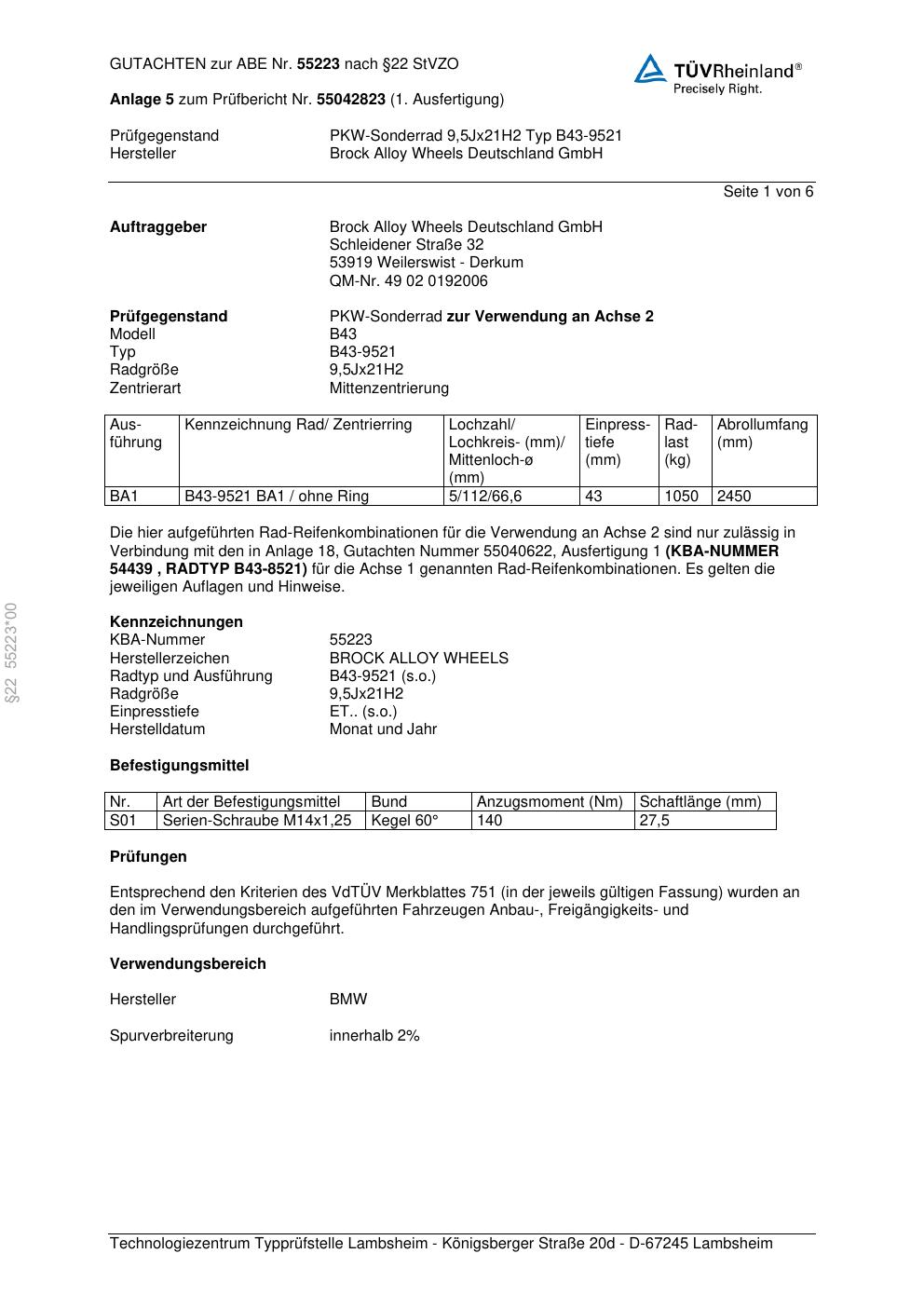 Dieses Gutachten (abe) bezieht sich auf die Alufelge Brock B43-9521 in der Ausführung 9.5Jx21 ET 0, Mittenloch 0 mm (KBA 55223). Im PDF findest du typischerweise zulässige Reifengrößen, Auflagen/Anbauhinweise und – je nach Dokument – Hinweise zur Eintragung.