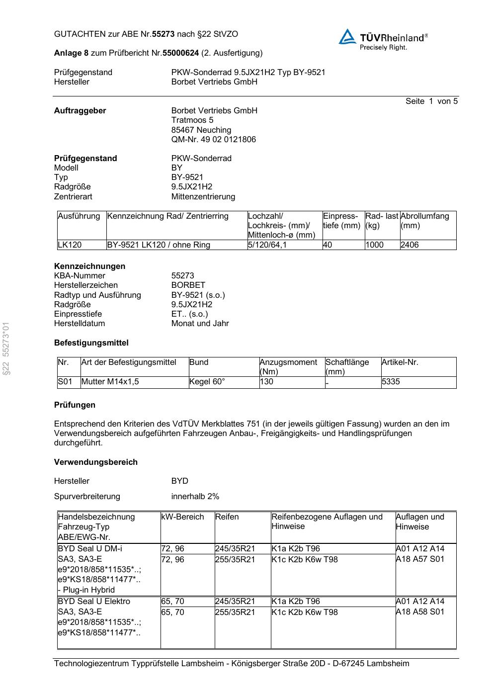Dieses Gutachten (abe) bezieht sich auf die Alufelge Borbet BY-9521 in der Ausführung 9.5Jx21 ET 0, Mittenloch 0 mm (KBA 55273). Im PDF findest du typischerweise zulässige Reifengrößen, Auflagen/Anbauhinweise und – je nach Dokument – Hinweise zur Eintragung.