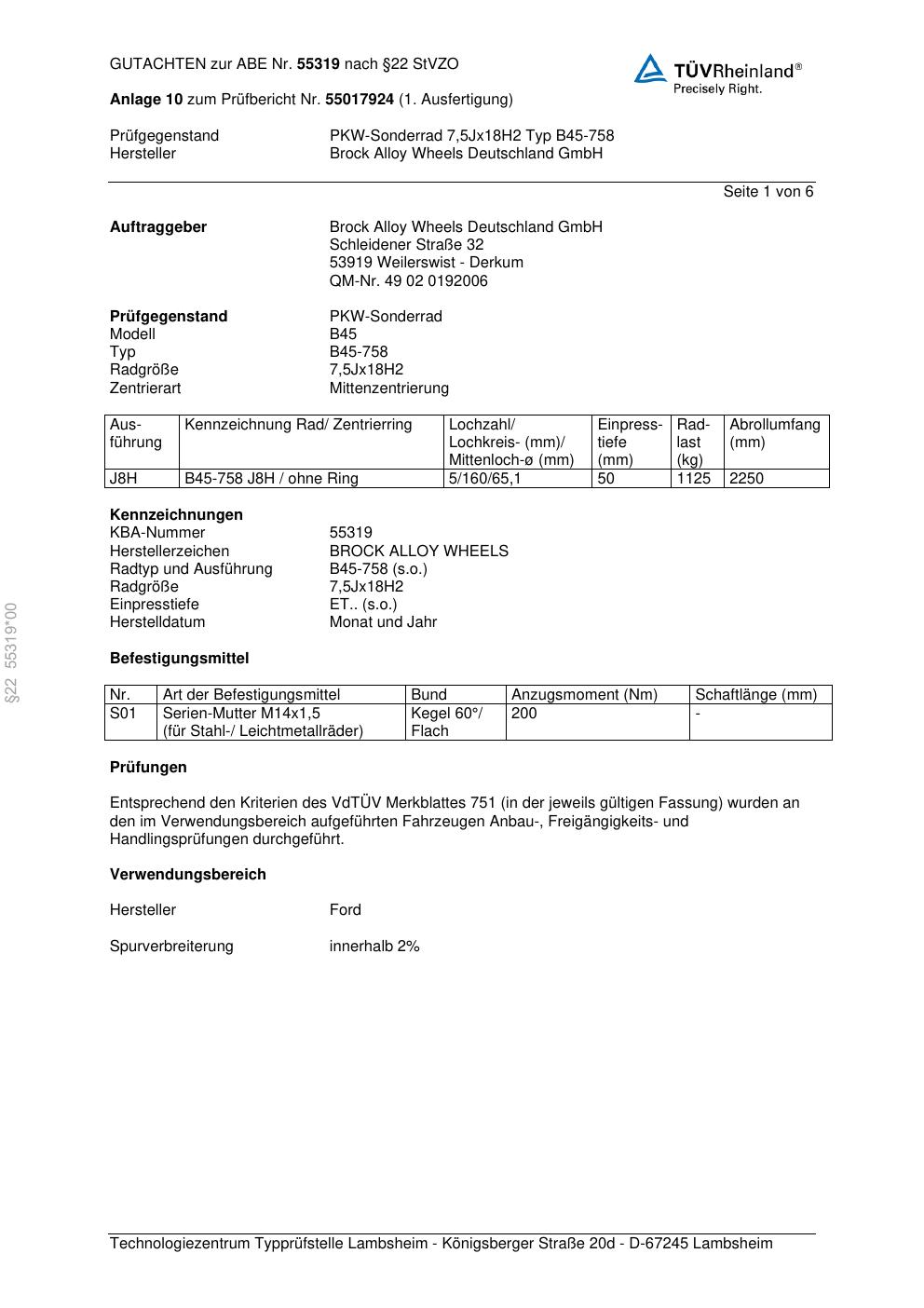 Dieses Gutachten (abe) bezieht sich auf die Alufelge Brock B45-758 in der Ausführung 7.5Jx18 ET 0, Mittenloch 0 mm (KBA 55319). Im PDF findest du typischerweise zulässige Reifengrößen, Auflagen/Anbauhinweise und – je nach Dokument – Hinweise zur Eintragung.