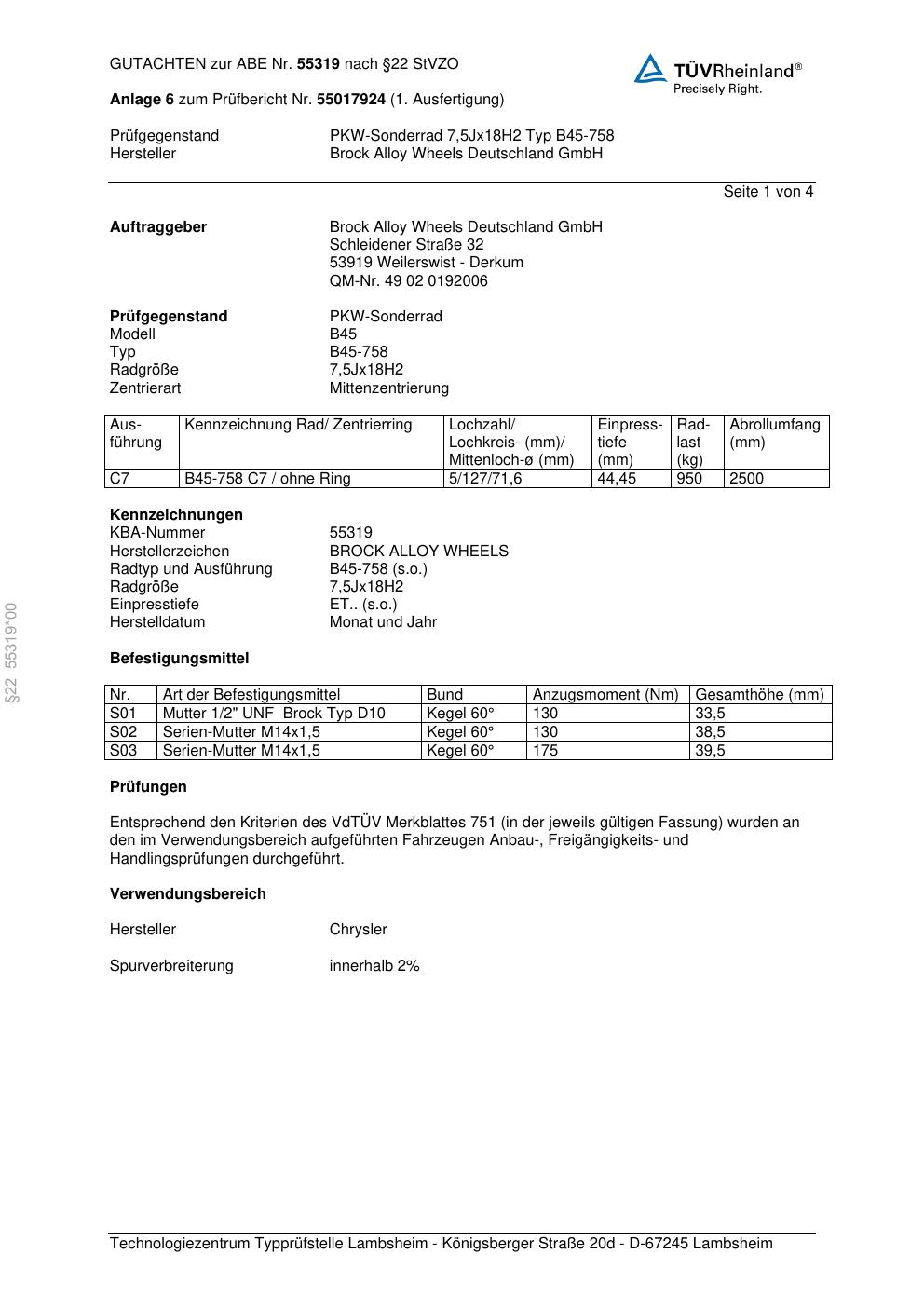 Dieses Gutachten (abe) bezieht sich auf die Alufelge Brock B45-758 in der Ausführung 7.5Jx18 ET 0, Mittenloch 0 mm (KBA 55319). Im PDF findest du typischerweise zulässige Reifengrößen, Auflagen/Anbauhinweise und – je nach Dokument – Hinweise zur Eintragung.