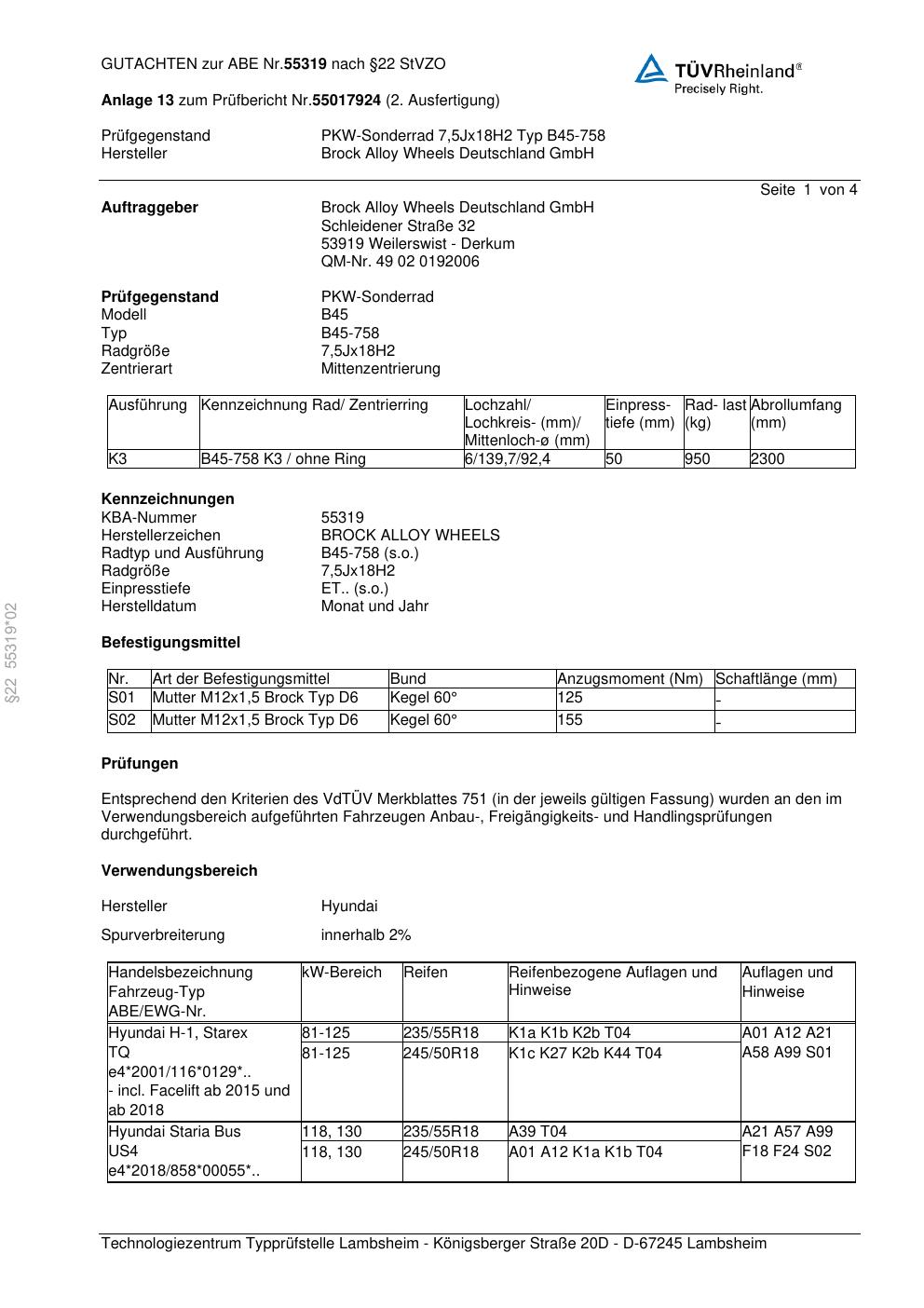 Dieses Gutachten (abe) bezieht sich auf die Alufelge Brock B45-758 in der Ausführung 7.5Jx18 ET 0, Mittenloch 0 mm (KBA 55319). Im PDF findest du typischerweise zulässige Reifengrößen, Auflagen/Anbauhinweise und – je nach Dokument – Hinweise zur Eintragung.