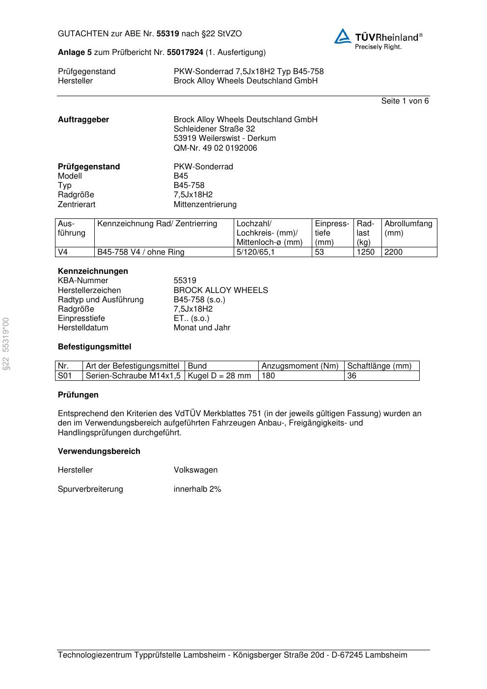 Felgengutachten / abe für Alufelgen Brock B45-758 (7.5Jx18 ET 0, Mittenloch 0 mm) mit KBA 55319 (Zertifikatsnummer 55319). Hier kostenlos als PDF herunterladen. Der Download-Link ist 24 Stunden gültig und kann bis zu zwei Mal verwendet werden.