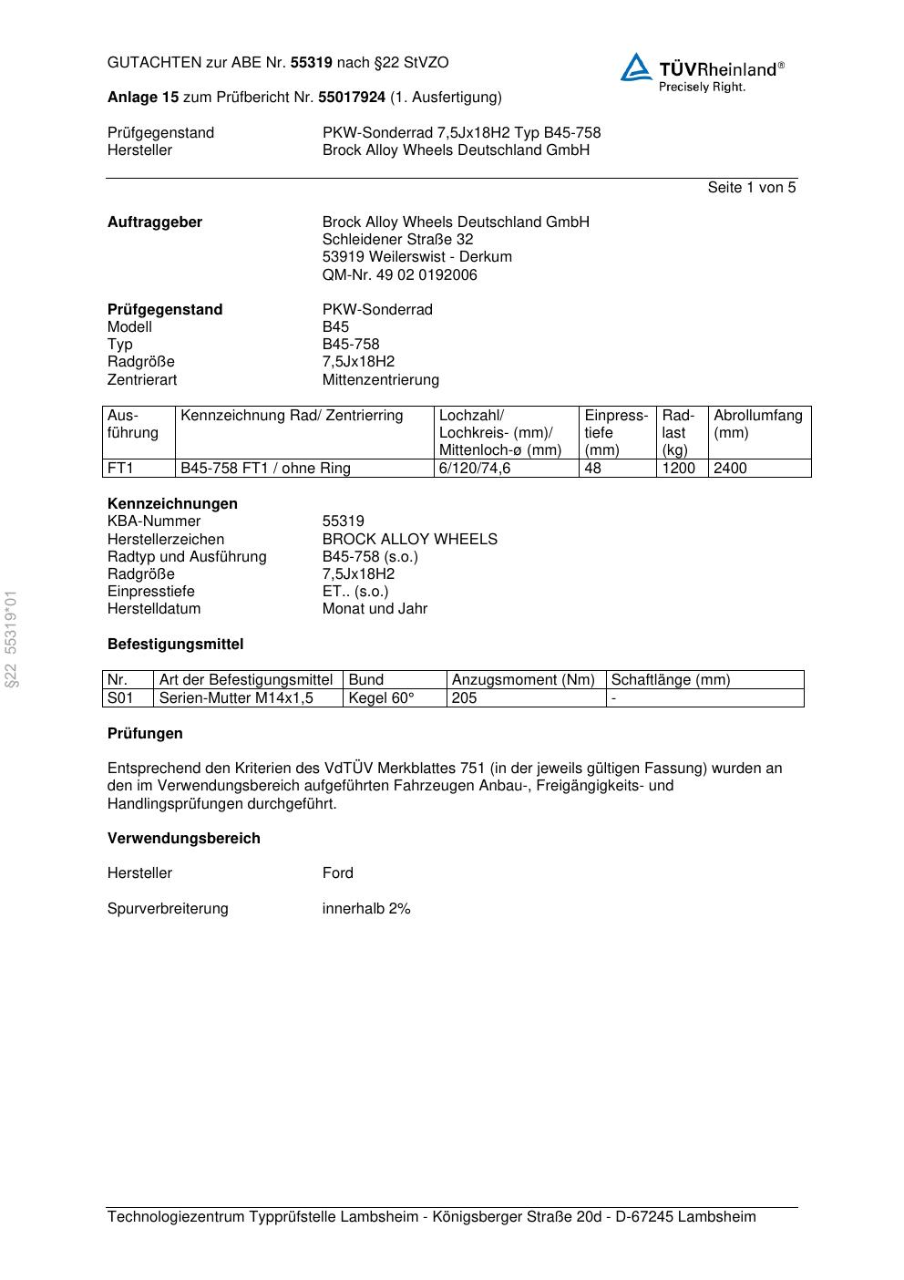 Felgengutachten / abe für Alufelgen Brock B45-758 (7.5Jx18 ET 0, Mittenloch 0 mm) mit KBA 55319 (Zertifikatsnummer 55319). Hier kostenlos als PDF herunterladen. Der Download-Link ist 24 Stunden gültig und kann bis zu zwei Mal verwendet werden.