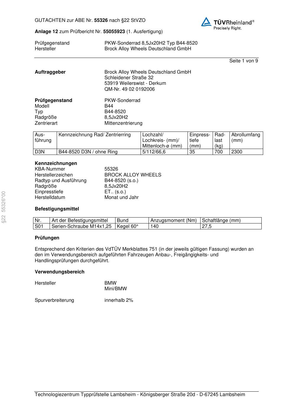 Dieses Gutachten (abe) bezieht sich auf die Alufelge Brock B44-8520 in der Ausführung 8.5Jx2 ET 0, Mittenloch 0 mm (KBA 55326). Im PDF findest du typischerweise zulässige Reifengrößen, Auflagen/Anbauhinweise und – je nach Dokument – Hinweise zur Eintragung.