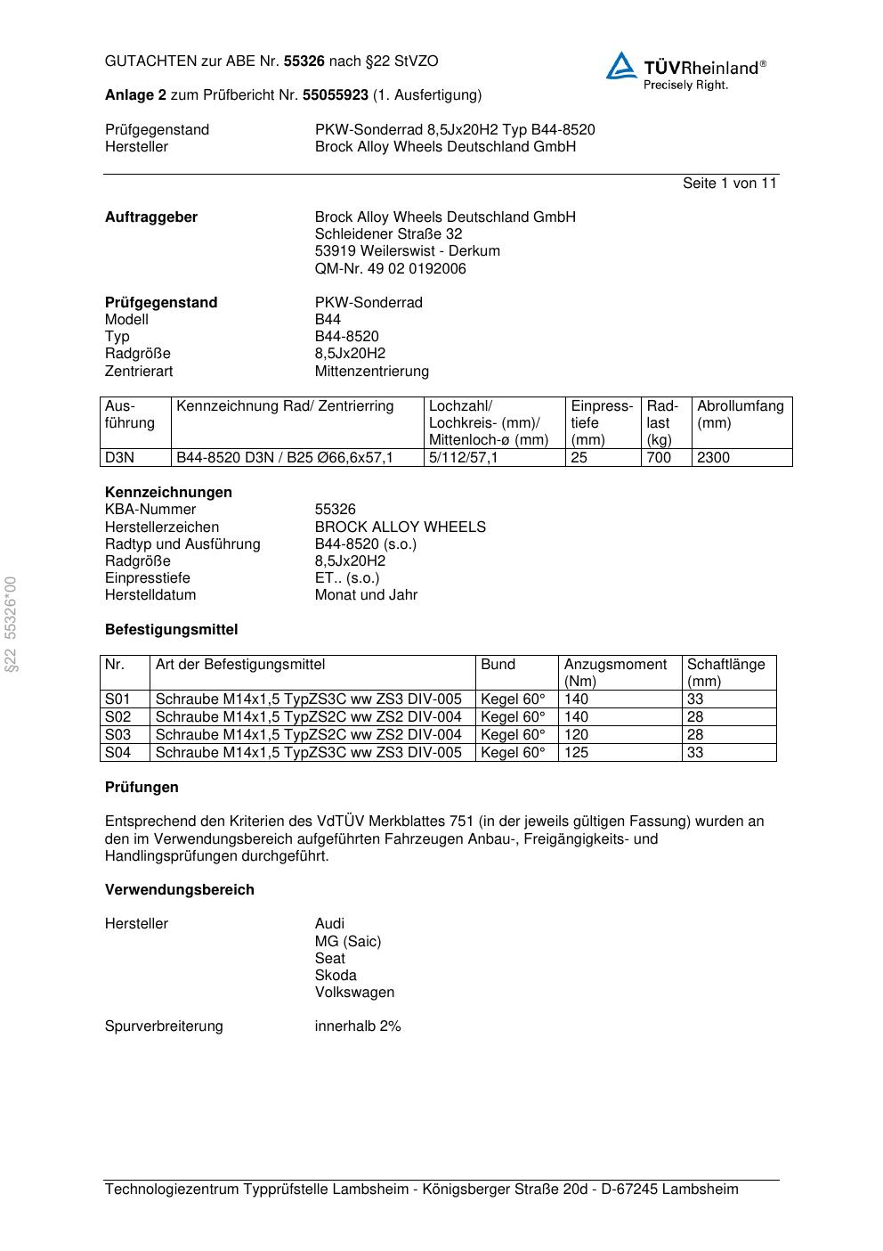 Dieses Gutachten (abe) bezieht sich auf die Alufelge Brock B44-8520 in der Ausführung 8.5Jx2 ET 0, Mittenloch 0 mm (KBA 55326). Im PDF findest du typischerweise zulässige Reifengrößen, Auflagen/Anbauhinweise und – je nach Dokument – Hinweise zur Eintragung.