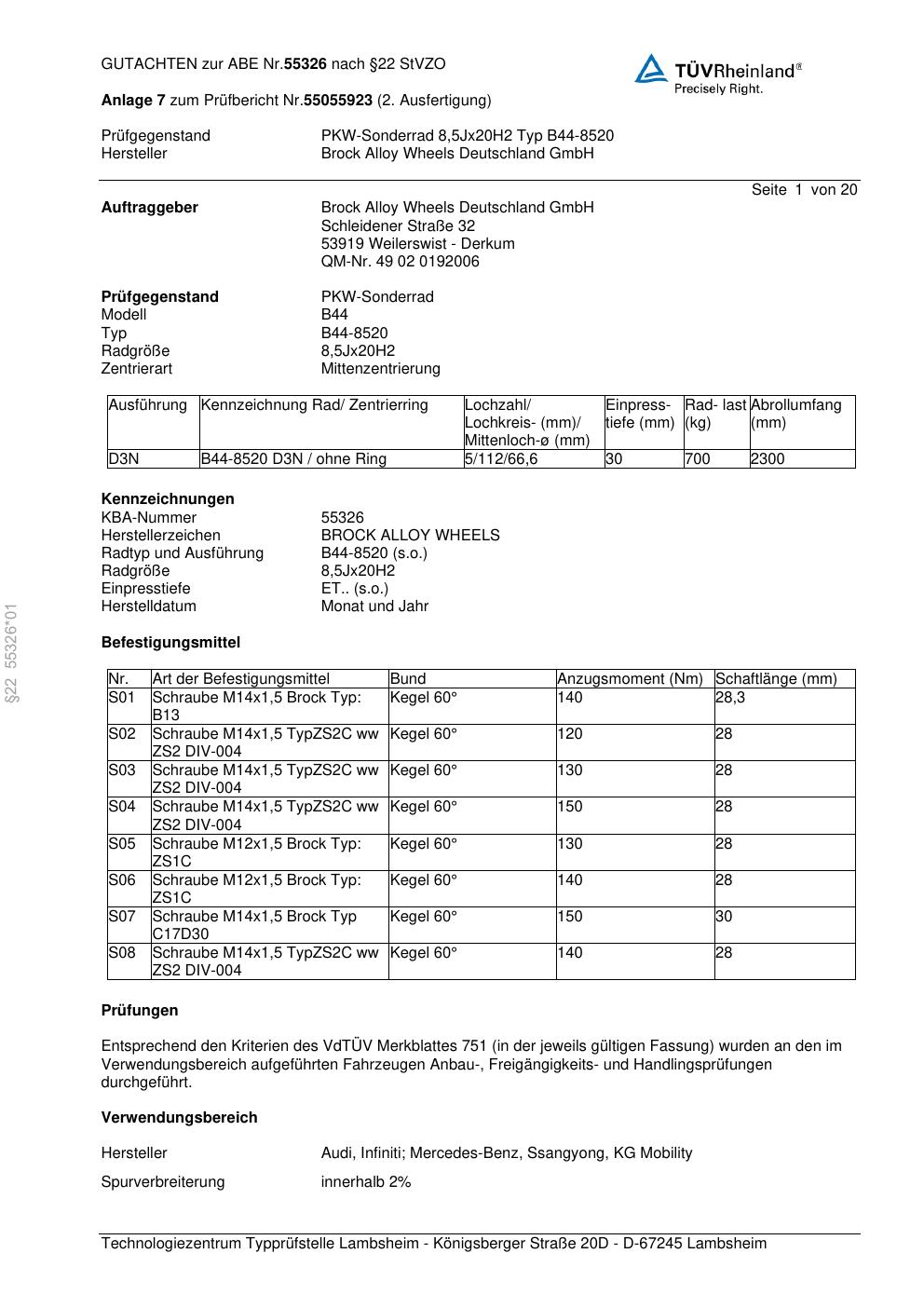 Dieses Gutachten (abe) bezieht sich auf die Alufelge Brock B44-8520 in der Ausführung 8.5Jx2 ET 0, Mittenloch 0 mm (KBA 55326). Im PDF findest du typischerweise zulässige Reifengrößen, Auflagen/Anbauhinweise und – je nach Dokument – Hinweise zur Eintragung.