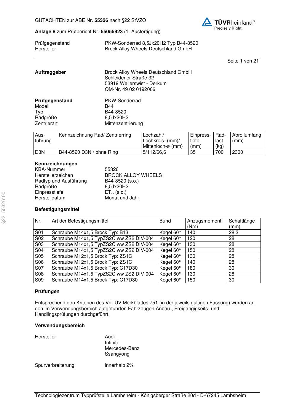 Felgengutachten / abe für Alufelgen Brock B44-8520 (8.5Jx2 ET 0, Mittenloch 0 mm) mit KBA 55326 (Zertifikatsnummer 55326). Hier kostenlos als PDF herunterladen. Der Download-Link ist 24 Stunden gültig und kann bis zu zwei Mal verwendet werden.