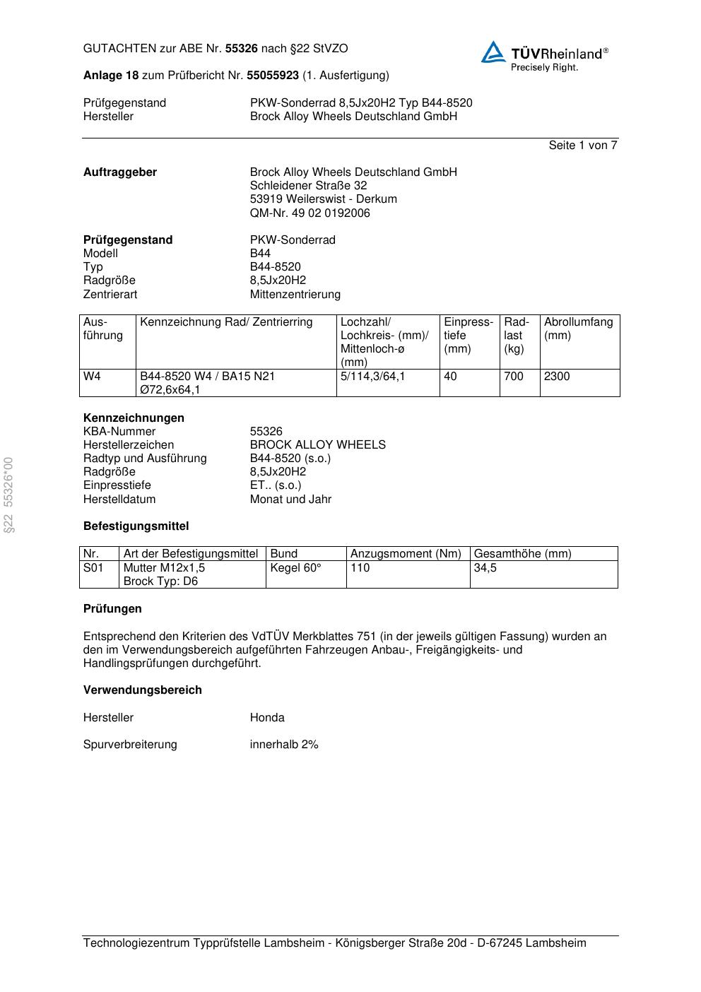 Dieses Gutachten (abe) bezieht sich auf die Alufelge Brock B44-8520 in der Ausführung 8.5Jx2 ET 0, Mittenloch 0 mm (KBA 55326). Im PDF findest du typischerweise zulässige Reifengrößen, Auflagen/Anbauhinweise und – je nach Dokument – Hinweise zur Eintragung.